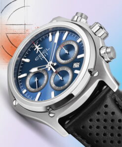 The EBEL 1911 Chronograph marks a modern reinterpretation of the classic 1980s design, gaining attention among watch collectors and enthusiasts. This timepiece skillfully blends robustness and elegance, establishing itself as a premier choice for the sophisticated man. The watch features a 44mm dial in graduating midnight blue with Super-LumiNova® coated indexes and hands, and a date display at 4:30. It’s equipped with a sapphire crystal face with anti-reflective underside coating and a sapphire crystal case back. Notable for its hexagonal shape and five screws, it seamlessly integrates with a stainless steel bracelet featuring a folding clasp, ensuring comfort. The rotor showcases EBEL’s distinctive “kissing E” emblem, reflecting the brand’s legacy and ethos. An alternative black calf-skin wristband offers versatility in styling. Powered by a Swiss automatic chronograph movement, the watch is water-resistant up to 10 bar, combining practicality with elegance. The EBEL 1911 Chronograph Galvanic Blue exemplifies charm and functionality, suited for both active and social settings.