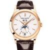 Patek Philippe offers its famous Annual Calendar in a 38 mm-diameter steel case to suit all wrists, paired with an integrated five-row bracelet. The shimmer of polished steel blends with an elegant midnight blue dial enhanced by vertical and horizontal satin-brushing. The day/date/month calendar requires only one manual correction per year.