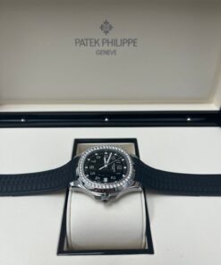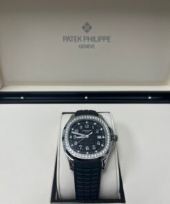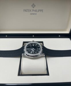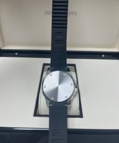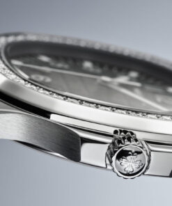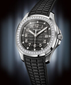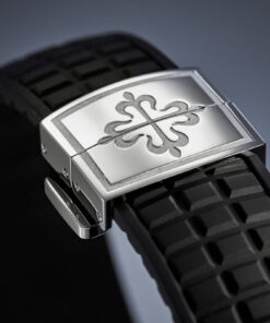 Patek Philippe reinterprets the quartz Aquanaut Luce in stainless steel with a larger diameter (38.8 mm) and a new integrated composite strap. This epitome of contemporary casual chic is attired in an elegant shade of black adorning the dial and matching strap. Water-resistant to 120m, the rounded octagonal case is enhanced by polished and satin finishes. The bezel is lit up by a row of 48 diamonds (~1.11 ct). The patented folding clasp is secured by four independent catches.