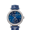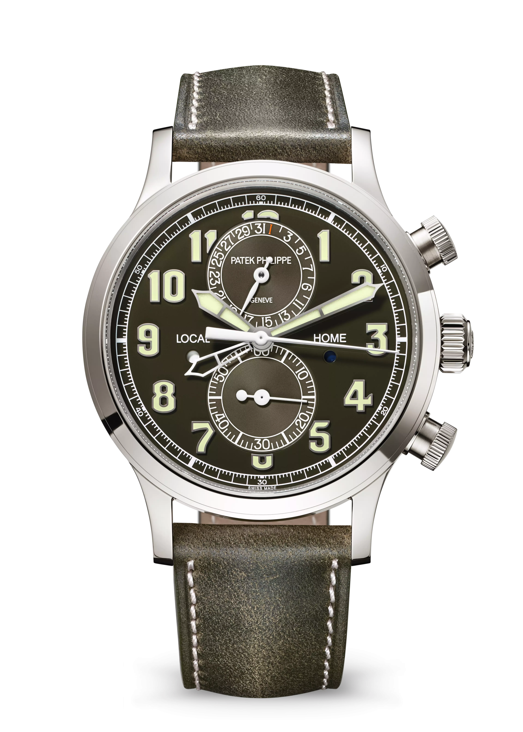 With a Pilot style inspired by the Patek Philippe aviator timepieces created in the 1930s, Reference 5924 combines a self-winding flyback chronograph, a Travel Time second time-zone display and a date hand coupled with local time. This white gold version is distinguished by its lacquered khaki green dial and its vintage-finish olive green strap.