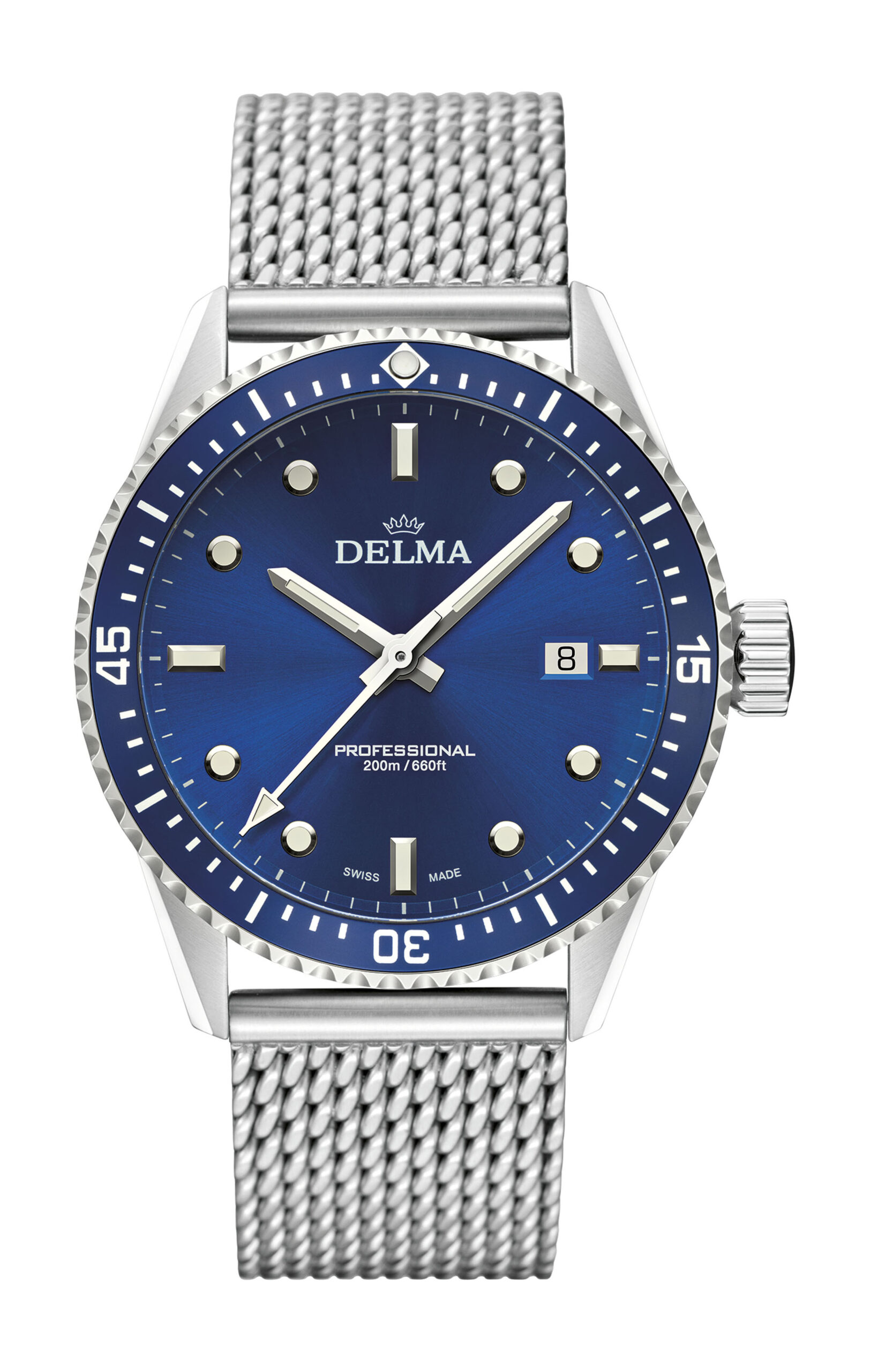 The Cayman watch is reminiscent of DELMA’s diving watches from the 1970s, a period when diving emerged as a popular global hobby. Its confident hands for hours, minutes, and seconds, coupled with bright luminous geometric markers on a blue sunray-patterned dial, and a blue anodized aluminum bezel, offer both functionality and elegance. Encased in durable stainless steel, the watch boasts a sturdy screw-down crown and can withstand depths up to 200 m / 660 ft. The watch’s quartz mechanism is encased behind a case back marked with DELMA’s engraving. A retro stainless steel Milanese mesh bracelet completes a timepiece that is prepared for all great experiences.