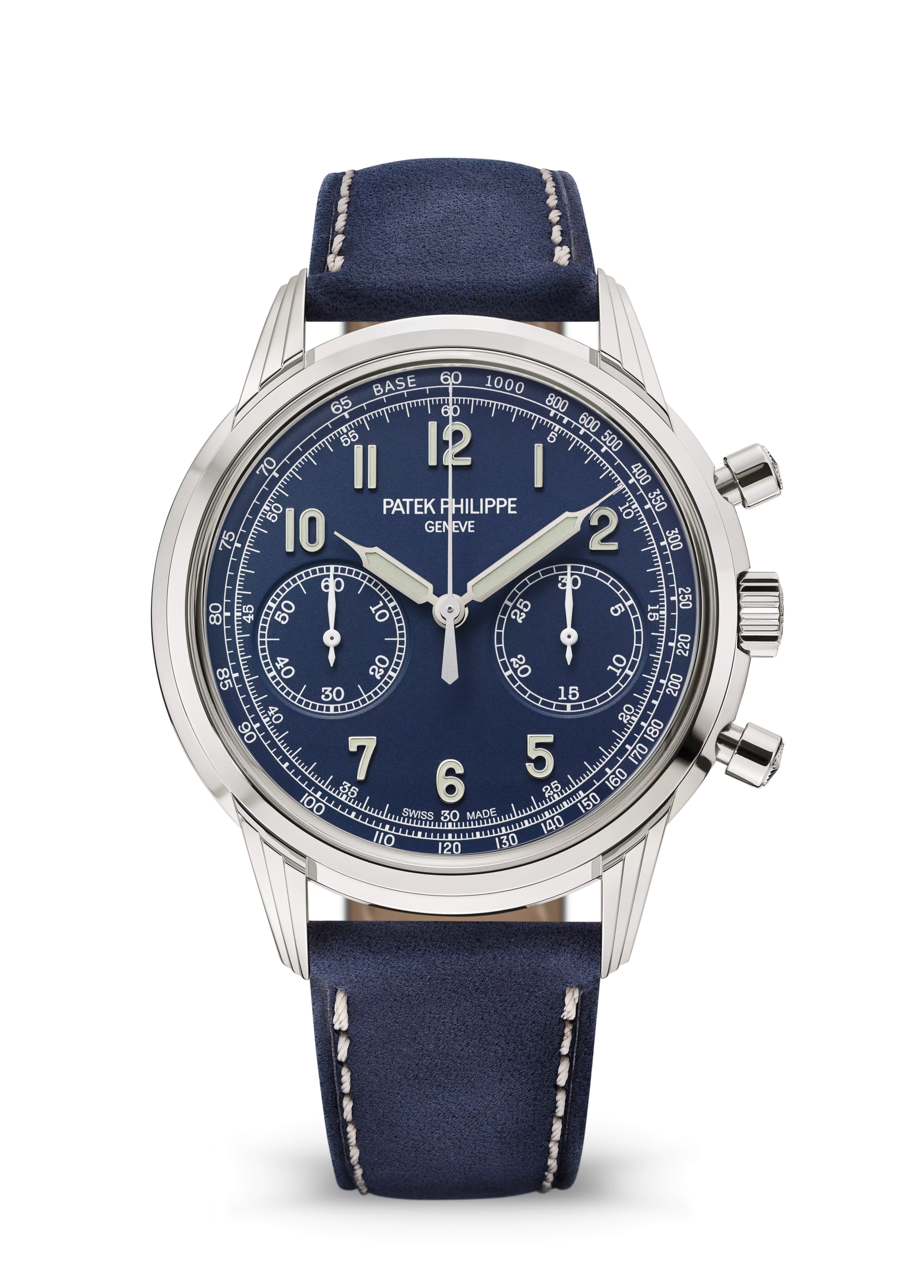 A NEW WHITE-GOLD CASE AND BLUE DIAL Patek Philippe has redesigned its chronograph of classic architecture for men (column wheel, horizontal clutch and manual winding), endowing it with a new white gold case with round guilloched pushers and three-tier lugs. Its subtle vintage allure is underscored by a sapphire-crystal “box” glass. The dial also sports an all-new look with a blue background and contrast luminescent white gold applied Arabic numerals and hands. WATCH Mechanical manually wound movement. Caliber CH 29‑535 PS. Chronograph. Central chronograph hand. Instantaneous 30-minute counter. Small seconds. DIAL Blue varnished, gold applied numerals with luminescent coating. Tachymeter scale. CASE White gold. Sapphire-crystal case back. Water-resistant to 30m. Diameter: 41 mm. Height: 11.45 mm. BRACELET / STRAP Calfskin, hand-stitched, navy blue. Fold-over clasp.