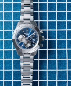 This new edition to the ZENITH Chronomaster Sport line features a metallic blue dial reminiscent of the night sky. This modern El Primero chronograph, which had previously won the 2021 Grand Prix d’Horlogerie de Genève “Chronograph” prize, now boasts design elements reminiscent of the “DeLuca” and “Rainbow” models from the late 20th century. version features a polished steel bezel and an all-steel case and bracelet. Unlike its predecessors, which had a ceramic bezel, this model’s 1/10th of a second bezel is crafted in stainless steel, giving it a retro touch. The metallic blue sunburst dial complements the tricolor design, with shades of grey and blue on its chronograph counters. Powered by the latest El Primero 3600 calibre, the watch boasts a high frequency, offering a true 1/10th of a second indication and an extended power reserve of 60 hours. The sapphire crystal at the back reveals the movement, including a blue column wheel and a distinct five-pointed star Zenith rotor.