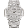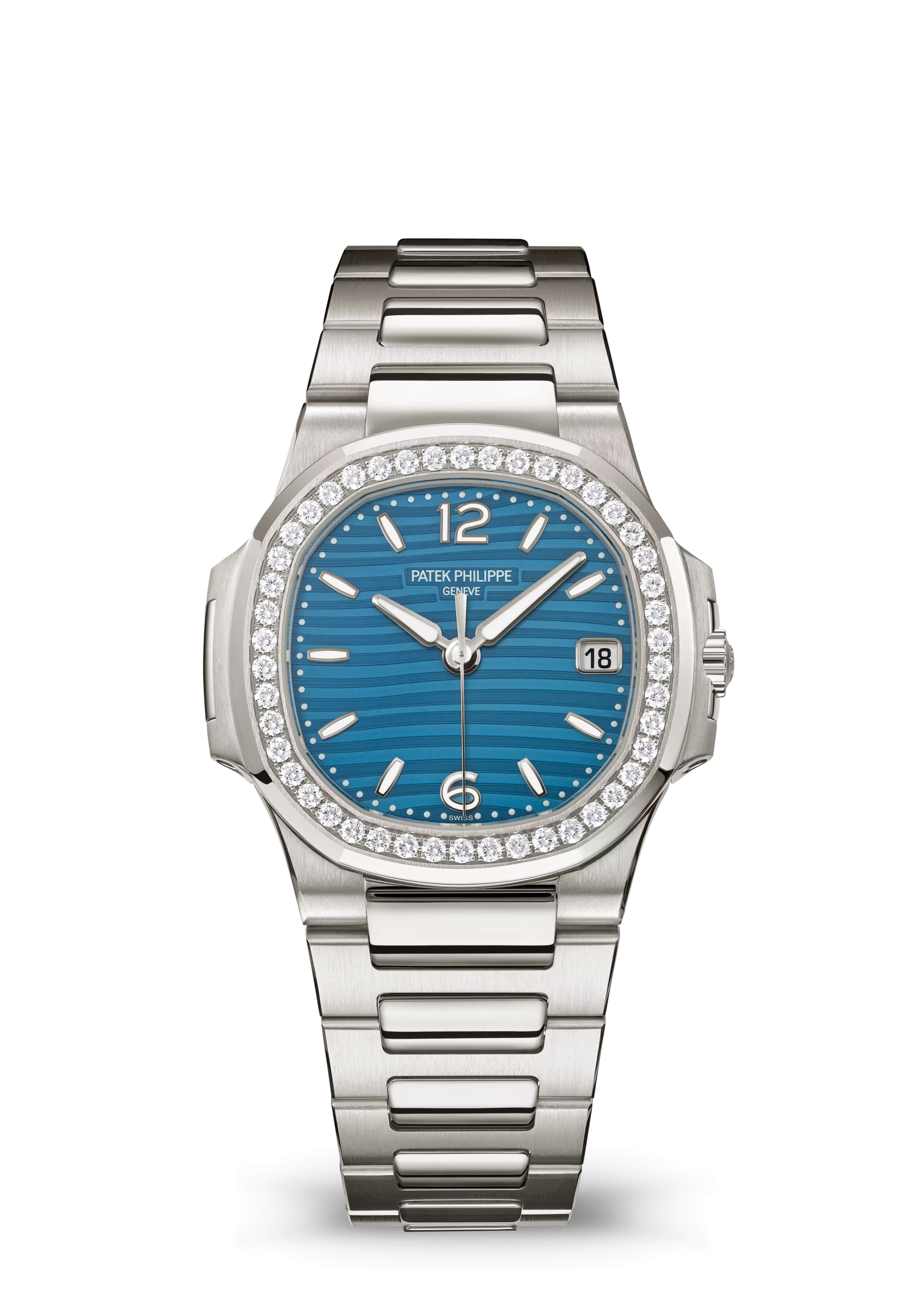 This Ladies’ Nautilus with quartz movement, 32 mm-diameter case and white gold bracelet is distinguished by the azure blue color of its lacquered dial adorned with the collection’s typical wave pattern. The case design is enhanced by alternating satin-brushed and polished finishes. The bezel is lit up by a row of brilliant-cut diamonds.