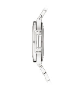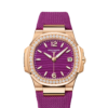 The Ladies Automatic Nautilus in steel with diamond-set bezel asserts its presence on the wrist with a slightly larger diameter (35.2 mm instead of 33.6 mm). Patek Philippe has also revised its range of dial colors, introducing blue opaline, silvery opaline or gray opaline, grading to black at the periphery. The steel bracelet comes with a fold-over clasp, endowed with a new adjustment system, providing the wearer with between 2 and 4 mm of extra bracelet length for increased comfort. WATCH Self-winding mechanical movement. Caliber 324 S C. Date in an aperture. Sweep seconds hand. DIAL Gray opaline, black gradated, gold applied hour markers and numerals with luminescent coating. CASE Steel. Sapphire crystal case back. Water-resistant to 60 m. Case diameter (10–4 o’clock): 35.2 mm. Height: 8.62 mm. GEMSETTING 56 diamonds: ~0.67 ct. (bezel). STRAP Steel. Nautilus fold-over clasp.