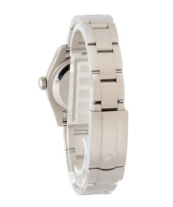 Ladies Rolex Oyster Perpetual ref. 176200 (2019) features a sleek black dial with index hour markers filled with Super-LumiNova for optimal legibility. The 26mm stainless steel case is fitted with a smooth bezel and classic Oyster bracelet, offering a refined yet sporty look. Powered by the reliable Caliber 2231 automatic movement, this timepiece embodies Rolex precision, durability, and timeless everyday style.