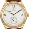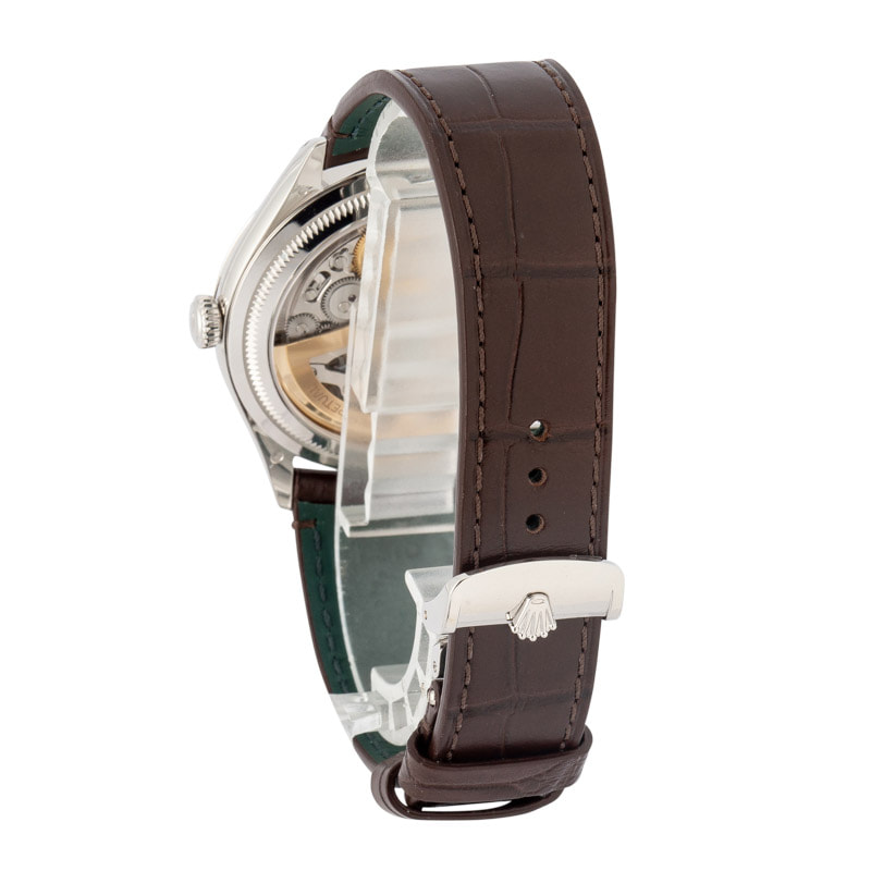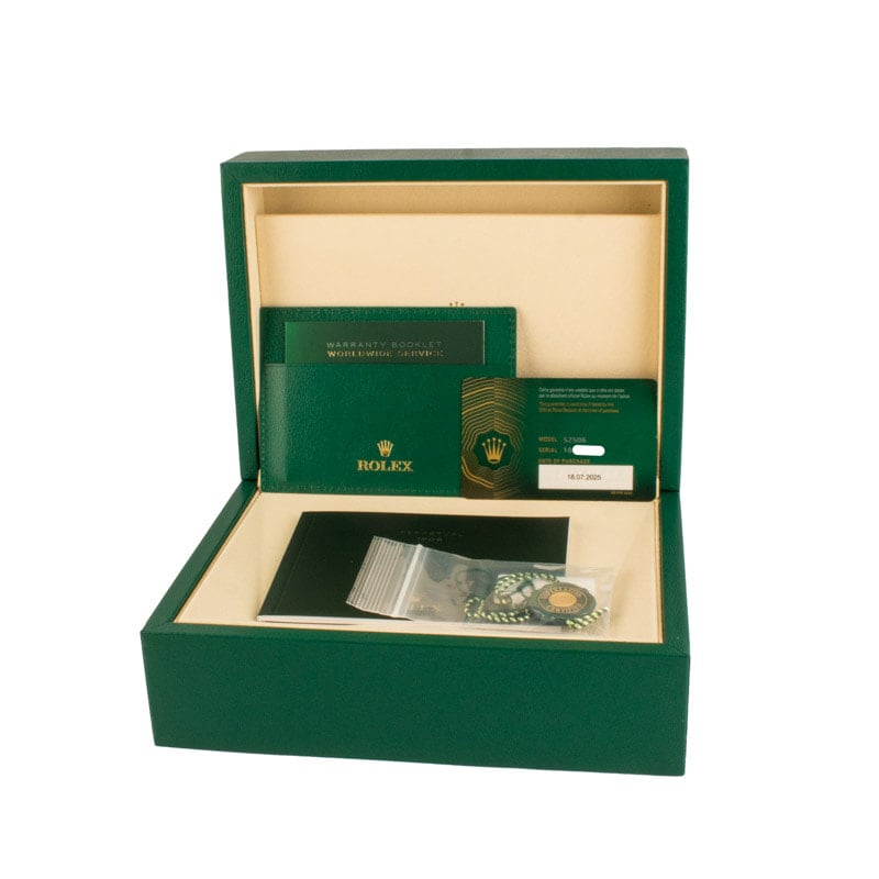 This Rolex Perpetual 1908 ref. 52506 (2025) is the first of its kind to hit our site, featuring a 39mm polished platinum case with domed and fluted bezel, domed crown, scratch-resistant sapphire crystal, and a transparent case back with anti-reflective coating, waterproof to 50m/165ft. The stunning ice-blue rice-grain motif dial is paired with center hour and minute hands, a small seconds at 6 o’clock, and powered by the Rolex Calibre 7140 automatic movement with Syloxi silicon hairspring, Paraflex shock absorbers, bidirectional self-winding rotor, and a 66-hour power reserve.
