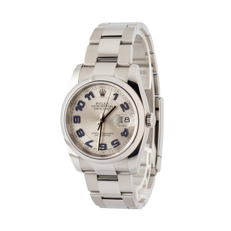 This Rolex Datejust ref. 116200 (2017) features a 36mm stainless steel case with a smooth bezel and classic Oyster bracelet. The silver dial stands out with an elegant decorated motif and applied Arabic numerals, blending traditional aesthetics with subtle detail. Powered by the reliable Caliber 3135, this Datejust delivers precise timekeeping and timeless design in a versatile everyday package.