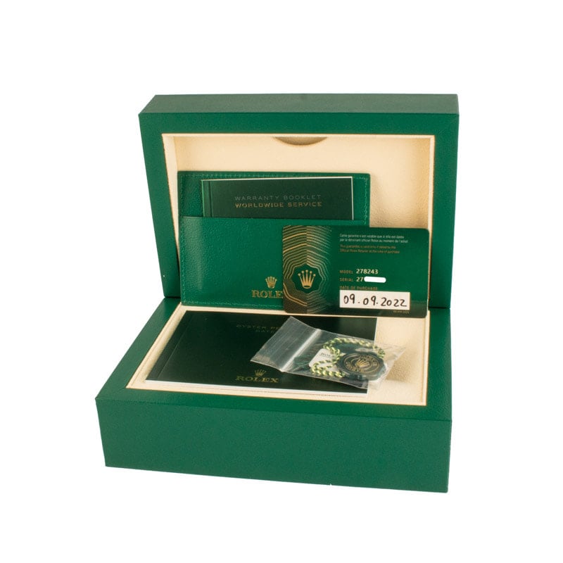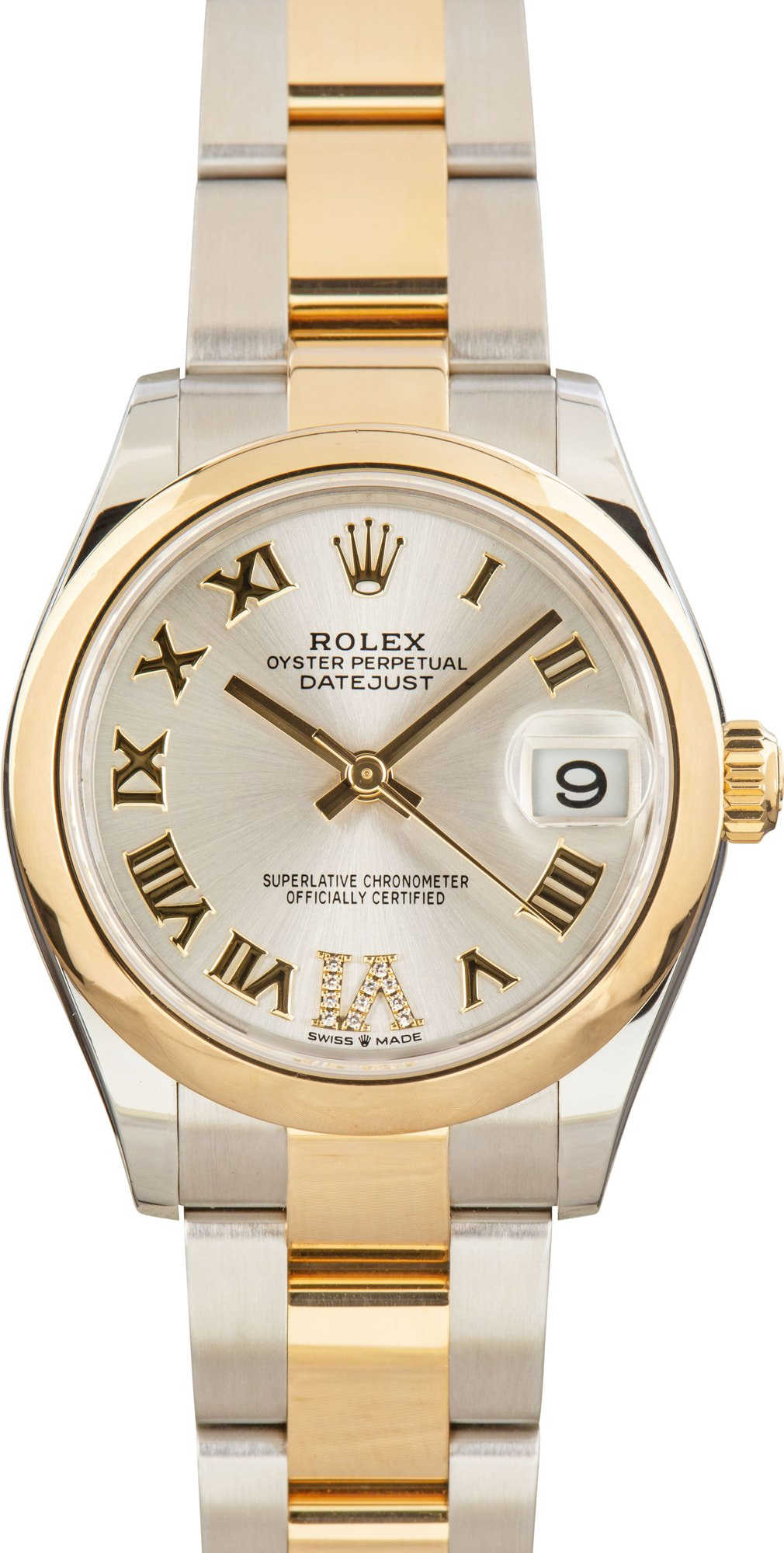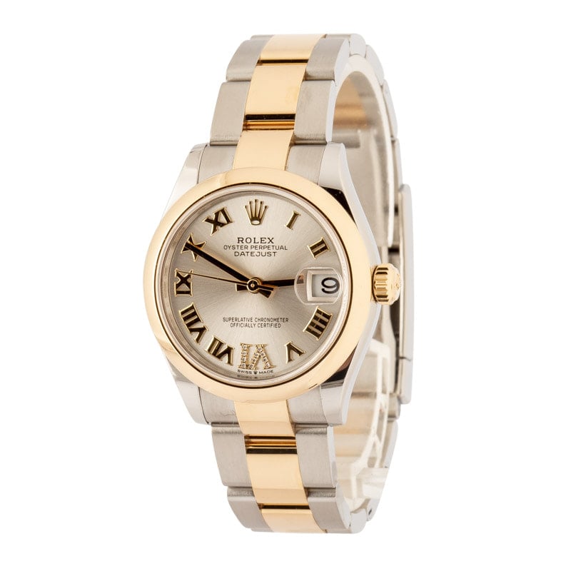 This Rolex Datejust ref. 278243 (2022) features a 31mm stainless steel case with an 18k yellow gold smooth bezel, creating a refined two-tone look. The silver Roman dial is highlighted by a diamond-set “VI,” adding a subtle touch of elegance. Powered by the Caliber 2236 automatic movement and fitted with a two-tone Oyster bracelet, this Datejust blends modern precision with timeless Rolex style.