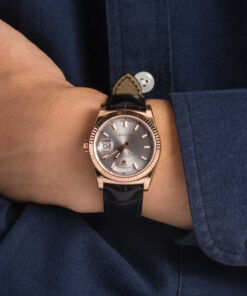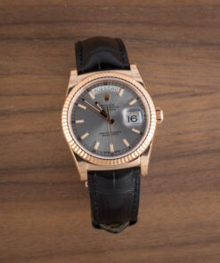 This Rolex Day-Date 36 ref. 118135 (2017) exudes classic elegance with a confident presence. Crafted in 18k Everose gold, it features a sharp fluted bezel and a clean silver dial with index hour markers filled with Superluminova for enhanced legibility. The 36mm case, caseback, and matching gold clasp are all factory stickered, paired with a supple Rolex leather strap for a refined yet robust look. Powered by Rolex’s trusted automatic movement, this Day-Date delivers precision, reliability, and unmistakable style in every detail.
