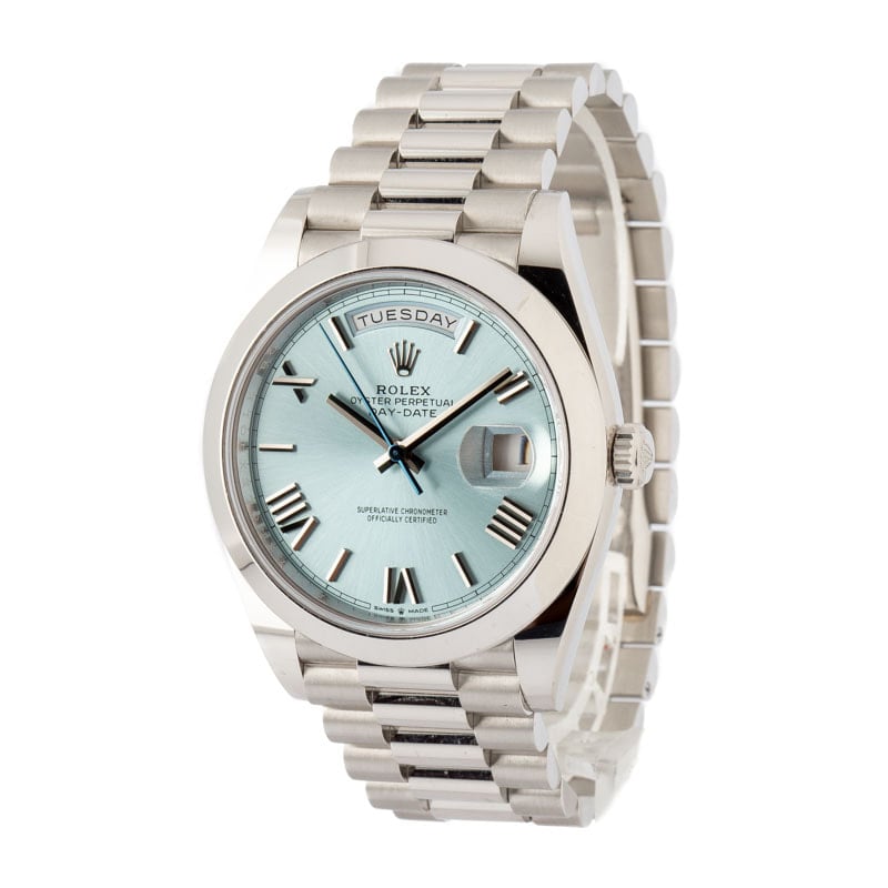 Rolex Day-Date 40 ref. 228206 (2022) is the pinnacle of modern elegance and precision. Featuring a 40MM platinum case paired with a striking ice blue Roman dial, this timepiece exudes sophistication. Powered by the Rolex Caliber 3255 automatic movement with a 70-hour power reserve, it offers the iconic Day-Date display at 12 o’clock and the date at 3 o’clock. The President bracelet ensures a comfortable and secure fit while maintaining a refined, luxurious profile. With a scratch-resistant sapphire crystal and water resistance up to 100 meters (330 feet), this Day-Date 40 is a perfect blend of heritage, performance, and style.