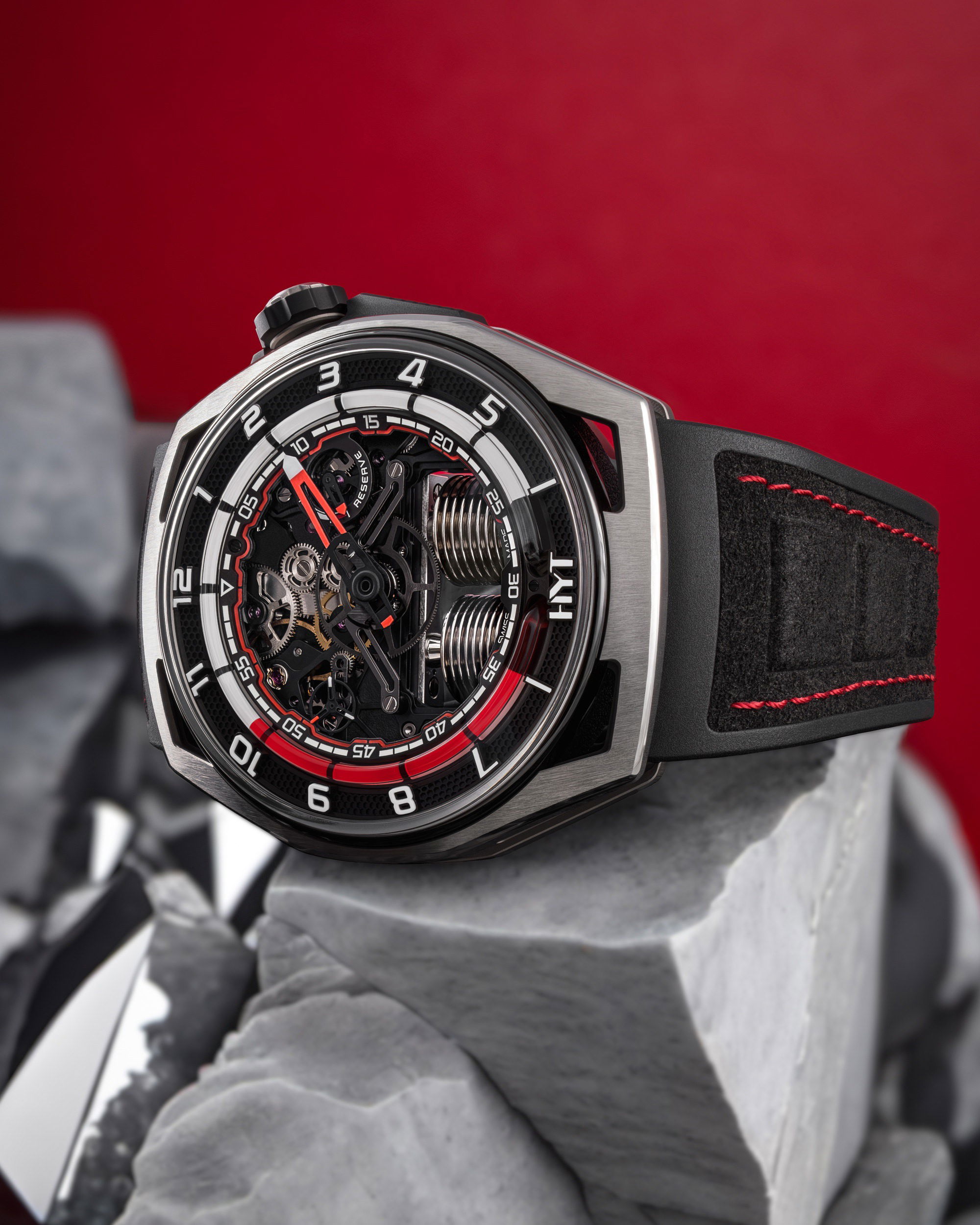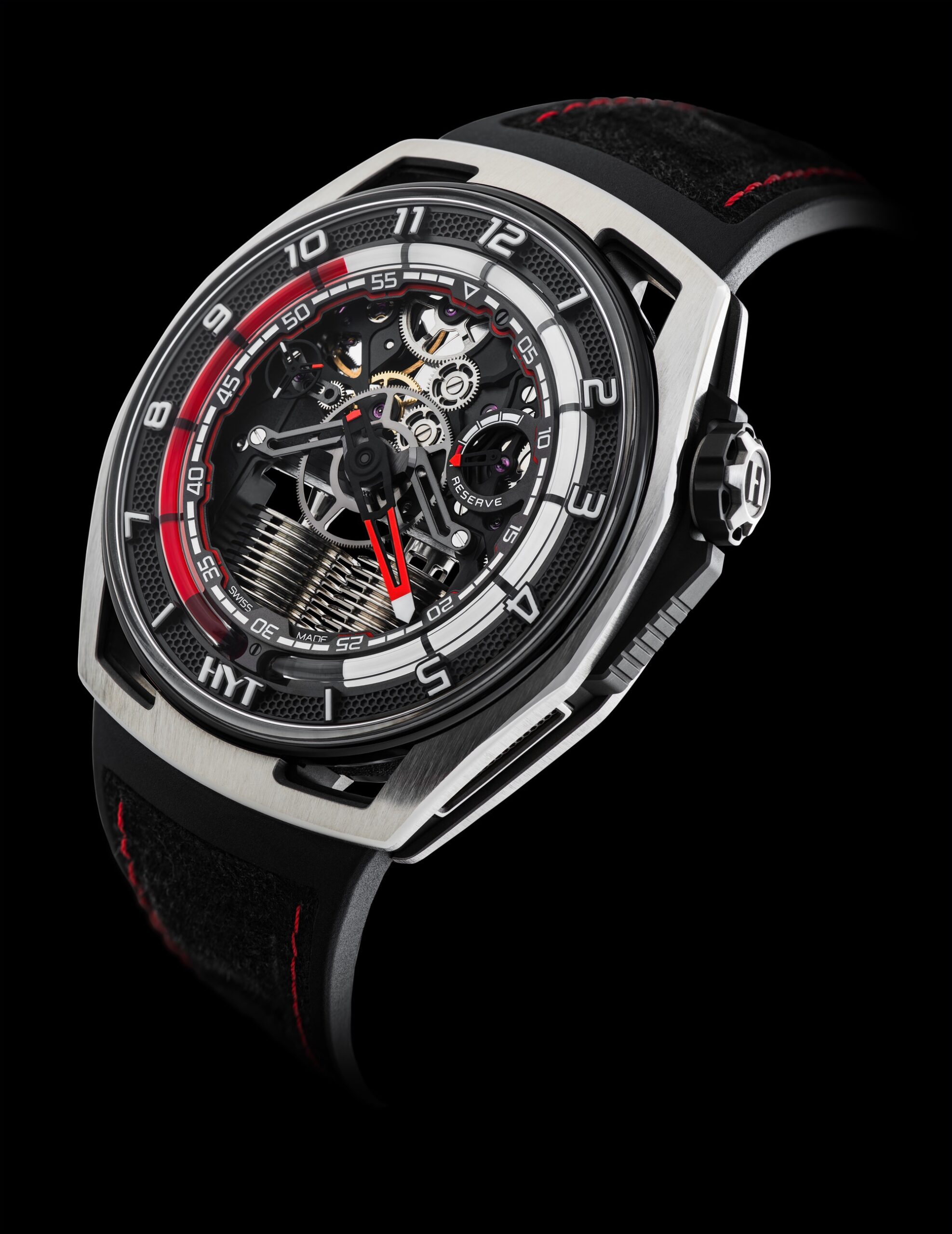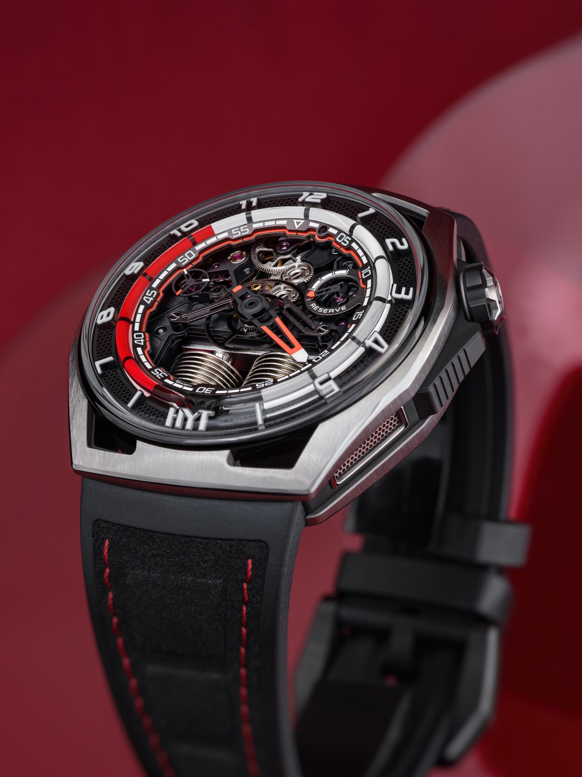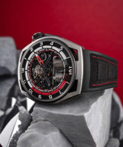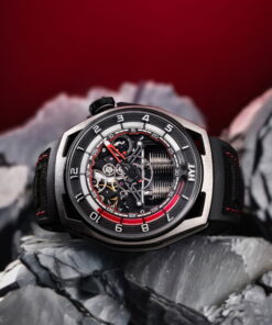 The HYT HASTROID Silver Red is an embodiment of modern and contemporary style, limited to only 15 pieces. It boasts of an impeccable design with curves as captivating as its satin finishes. The watch case, with dimensions of 48 mm in diameter, a lug-to-lug distance of 52.3 mm, and a 13.3 mm thickness, is constructed using an array of advanced materials, including titanium, titanium with carbon, and a unique alloy that merges stabilized bronze with carbon. The dial, which has undergone extensive redesigning to boost legibility, features a prominently displayed central hand with a striking red coating. This is complemented by two sub-counters; one indicating small seconds on the left and the other, the power reserve, on the right. Furthermore, the watch introduces a retrograde time indication through a luminous red fluid that ensures hours are easily discernible both day and night. This is accentuated by a capillary dial infused with white Super-LumiNova® and hour markers carved from blocks of the same material. The HASTROID Silver Red boasts a water resistance of up to 30 meters and is equipped with a central titanium container dedicated to safeguarding the movement. The timepiece’s reverse side presents an openworked dial back and mainplate, subtly laying bare the components of its hand-wound mechanical movement. This movement, a creation of Eric Coudray for the HASTROID collection, is further enhanced by modern finishes—namely satin brushing and bead-blasting, adding finesse to the overall look.