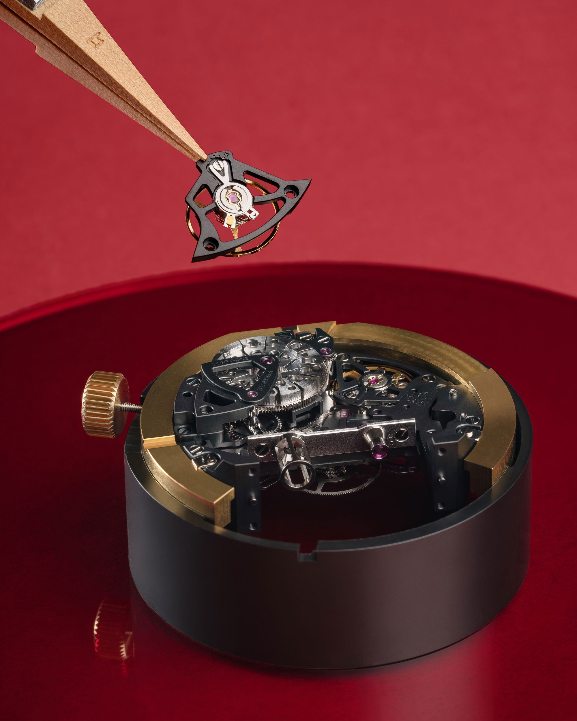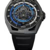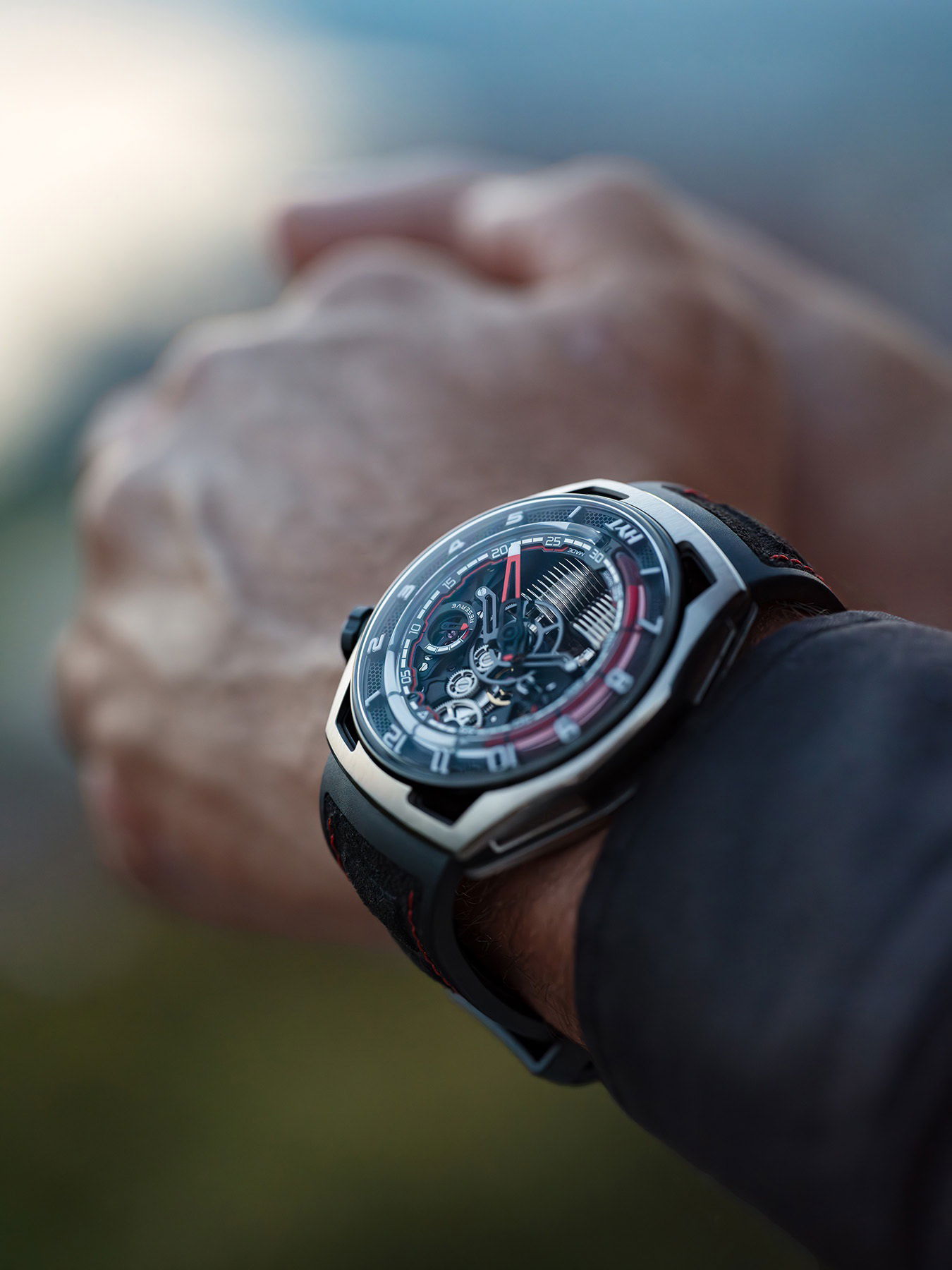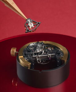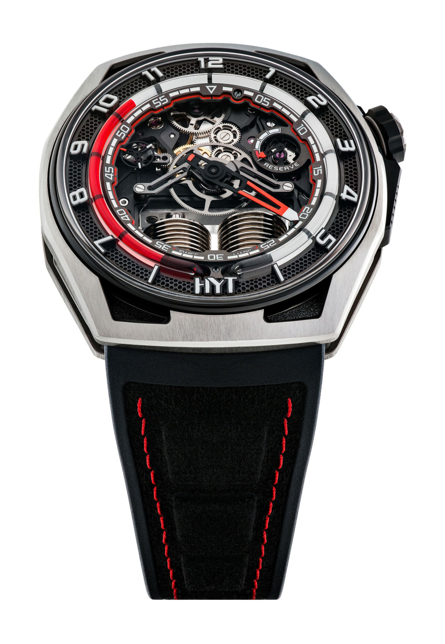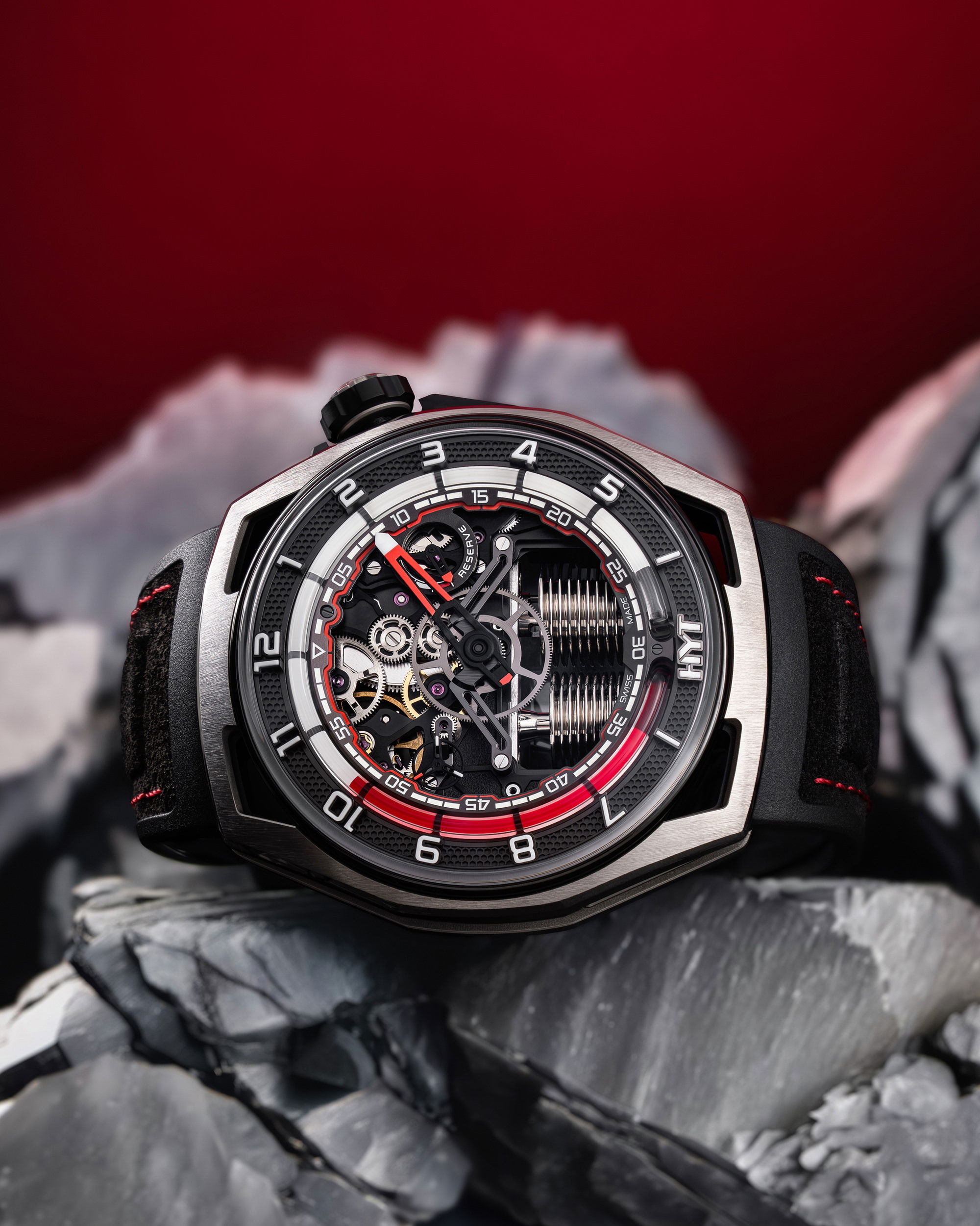 The HYT HASTROID Silver Red is an embodiment of modern and contemporary style, limited to only 15 pieces. It boasts of an impeccable design with curves as captivating as its satin finishes. The watch case, with dimensions of 48 mm in diameter, a lug-to-lug distance of 52.3 mm, and a 13.3 mm thickness, is constructed using an array of advanced materials, including titanium, titanium with carbon, and a unique alloy that merges stabilized bronze with carbon. The dial, which has undergone extensive redesigning to boost legibility, features a prominently displayed central hand with a striking red coating. This is complemented by two sub-counters; one indicating small seconds on the left and the other, the power reserve, on the right. Furthermore, the watch introduces a retrograde time indication through a luminous red fluid that ensures hours are easily discernible both day and night. This is accentuated by a capillary dial infused with white Super-LumiNova® and hour markers carved from blocks of the same material. The HASTROID Silver Red boasts a water resistance of up to 30 meters and is equipped with a central titanium container dedicated to safeguarding the movement. The timepiece’s reverse side presents an openworked dial back and mainplate, subtly laying bare the components of its hand-wound mechanical movement. This movement, a creation of Eric Coudray for the HASTROID collection, is further enhanced by modern finishes—namely satin brushing and bead-blasting, adding finesse to the overall look.