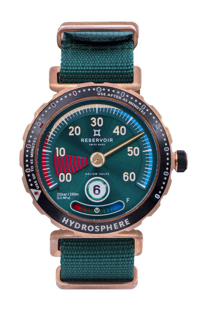 The Hydrosphere Cenote watch features a bronze case and a green dial. It’s designed for imminent underwater exploration, with a dive time of 45 minutes and a depth limit of 250 meters. This watch is all about embracing the desire for exploration and challenge, engaging both your senses and your mind. Before taking the plunge, make sure to meticulously check your equipment: the cylinders, oxygen supply, regulator, and stabilizer. The Hydrosphere Cenote watch pays homage to the natural wonders of Mexico’s cenotes, those ancient water-filled tunnels and wells illuminated by sunlight. When you explore these caves while diving, the light reveals an array of vibrant colors, particularly the dominant shades of green reflecting the surrounding jungle. The watch features include a unidirectional ceramic rotating bezel, a helium valve, and a bronze case that can withstand water pressure up to 250 meters. It has a green dial with sundial finish, and a power reserve indicator. The watch is complemented by a green NATO strap with bronze stirrups, further accentuating its unique style. It’s designed for radical time reading with a single hand on the dial. Inside, it’s powered by a Swiss-made self-winding mechanical movement, which combines a patented proprietary 124-piece module on an ETA2824 Caliber with a 37-hour power reserve, ensuring accuracy and reliability during your underwater adventures. When you receive your Hydrosphere Cenote watch, it will come in a waterproof container, and you’ll also get an additional rubber strap for added versatility. Enjoy your dive with this exceptional timepiece that celebrates both adventure and style.