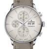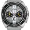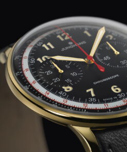 The Telemeter Edition JF by Junghans pays homage to a traditional chronograph from 1951, combining telemeter and tachymeter displays. It features a yellow gold-pvd case and a black dial, capturing the elegant yet sporty aesthetic of the original design. Limited to 150 pieces, this watch is a modern interpretation of a rare gold model from the past, inspired by a personal acquisition of the managing director, Hannes Steim. The telemeter scale, printed in red against a grey background, allows the wearer to measure the distance from events emitting light and sound, such as thunderstorms. The tachymeter scale, encircling the dial’s outer perimeter, measures average speeds. The watch boasts antireflective sapphire crystal, luminous numerals for readability, and is powered by automatic Caliber J880.3 with refined surfaces and blue screws visible through the case back. It is paired with a black leather strap with grey stitching to complement the telemeter scale.