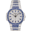 Patek Philippe displays the full extent of its gemsetting artistry in a white gold Nautilus Haute Joaillerie model paved with brilliant-cut diamonds and rubies. The Manufacture has chosen the highly refined “snow setting” technique to endow this precious adornment with its incomparable sparkle. The self-winding movement is visible through a transparent sapphire case-back.