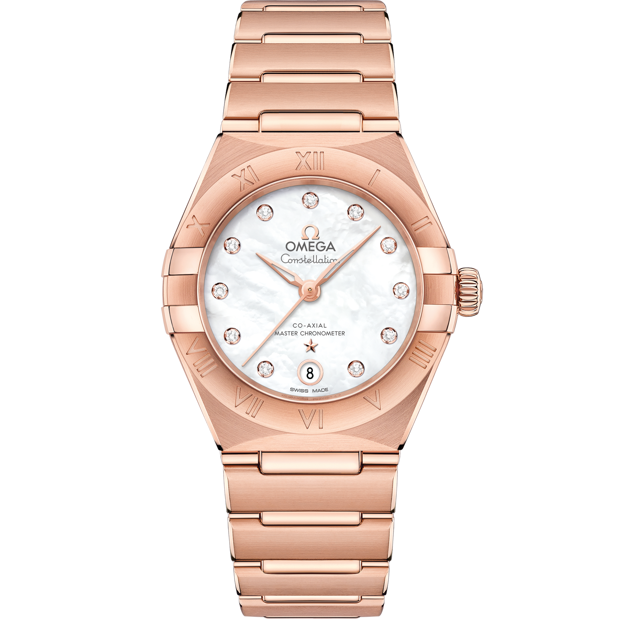 This 29 mm 18K Sedna™ gold model features a bezel engraved with Roman numerals, pearled mother-of-pearl dial with diamond hour markers and a date window at the 6 o’clock position. The bracelet, hands, OMEGA logo, Constellation star and diamond holders are also in 18K Sedna™ gold.