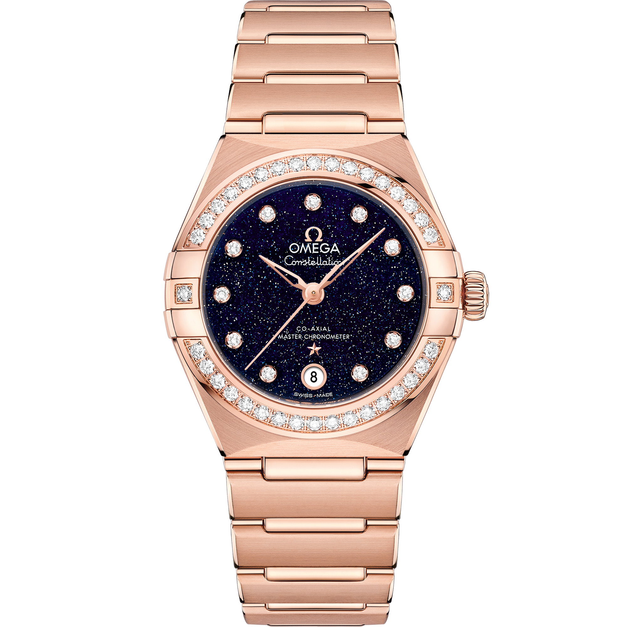 This 29 mm 18K Sedna™ gold model features a diamond-paved bezel, blue aventurine glass dial with diamond hour markers and a date window at the 6 o’clock position. The bracelet, hands, OMEGA logo, Constellation star and diamond holders are also in 18K Sedna™ gold.