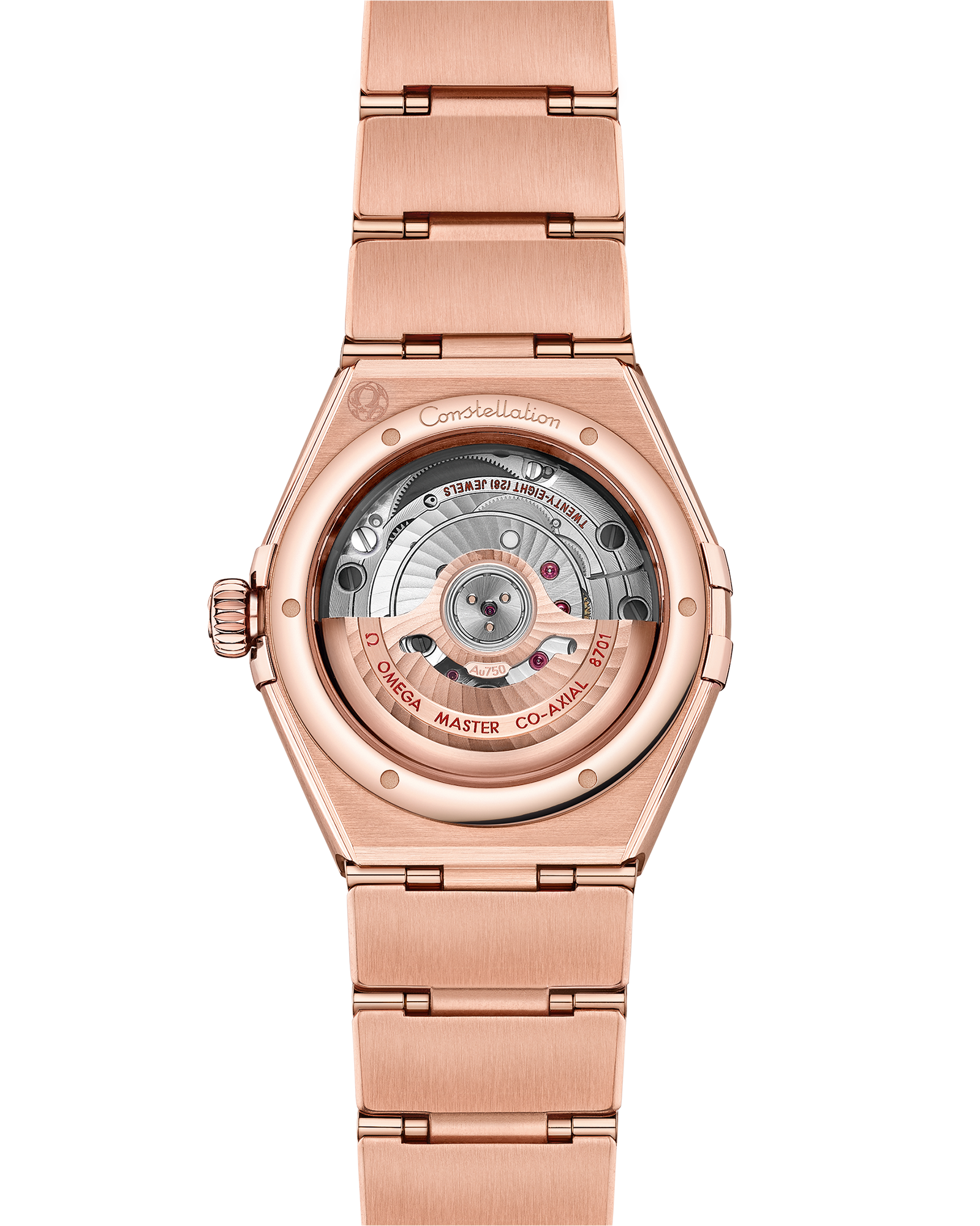 At the heart of this timepiece is the OMEGA Co-Axial Master Chronometer Calibre 8701, visible through the domed scratch-resistant sapphire crystal.