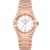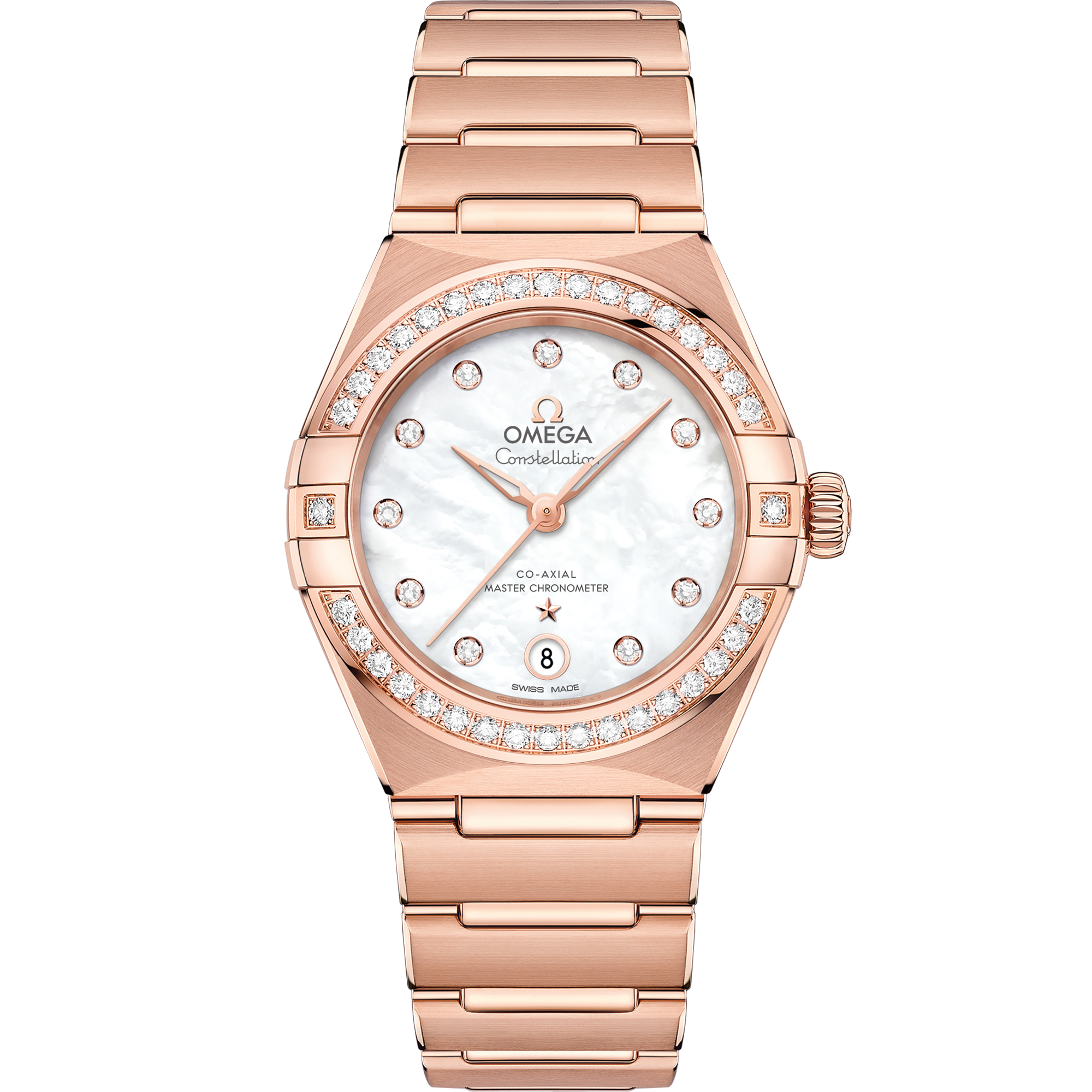 This 29 mm 18K Sedna™ gold model features a diamond-paved bezel, pearled mother-of-pearl dial with diamond hour markers and a date window at the 6 o’clock position. The bracelet, hands, OMEGA logo, Constellation star and diamond holders are also in 18K Sedna™ gold.