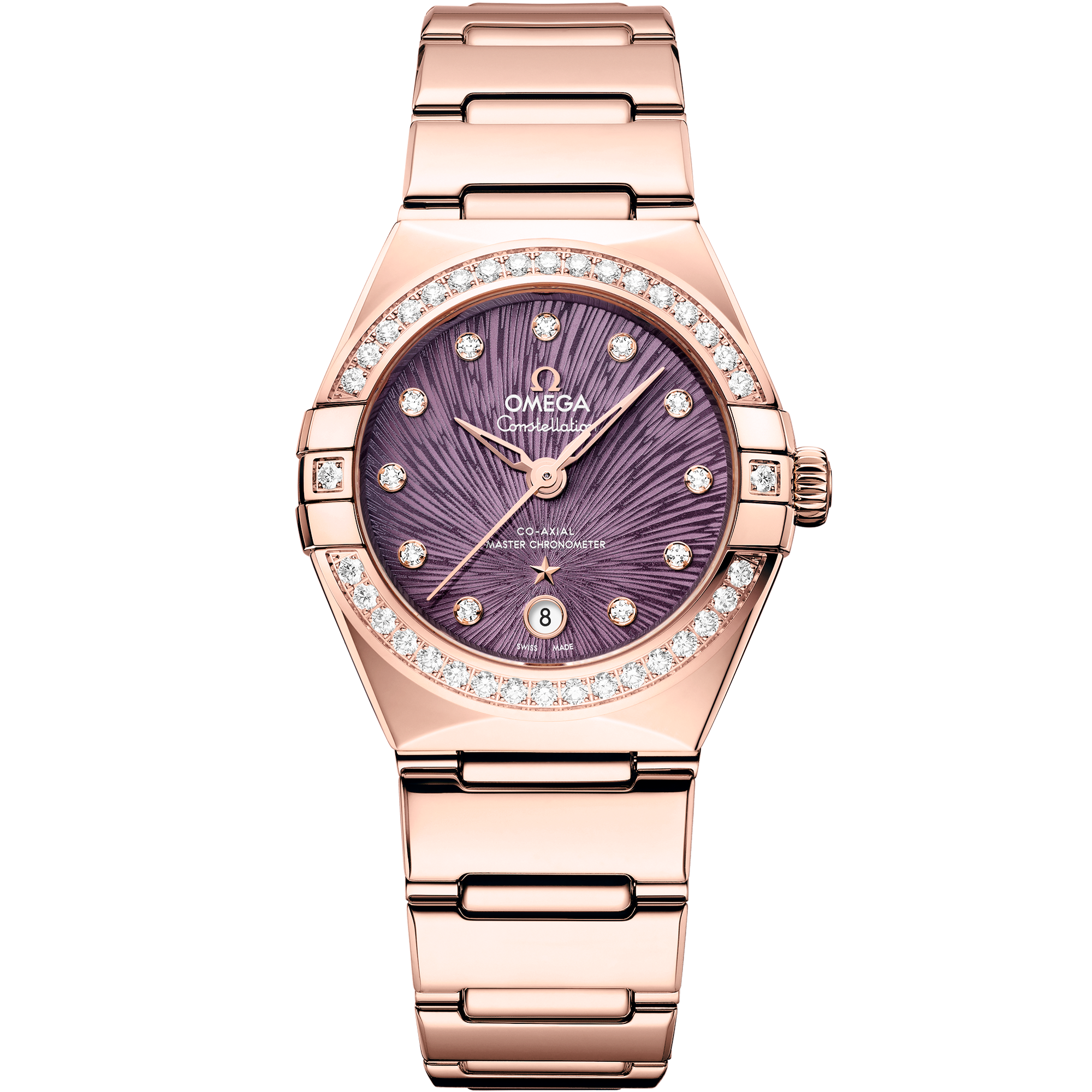 This 29 mm model is crafted in 18K Sedna™ Gold and features a radiant diamond-paved bezel. The PVD purple dial has been given a distinctive Supernova pattern through electrochemical etching, while other details include a date window at 6H, 18K Sedna™ Gold hands and star, and diamond hour markers in 18K Sedna™ Gold holders.