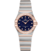 This 29 mm stainless steel model features a bezel engraved with Roman numerals, cream silvery dial with silk-like pattern, diamond hour markers and a date window at the 6 o’clock position. The hands, OMEGA logo, Constellation star and diamond holders are in 18K Sedna™ gold.