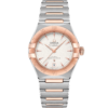 This 29 mm 18K Sedna™ gold and stainless steel model features a bezel engraved with Roman numerals, pearled mother-of-pearl dial and a date window at the 6 o’clock position. The hands, OMEGA logo, Constellation star and indexes are also in 18K Sedna™ gold.