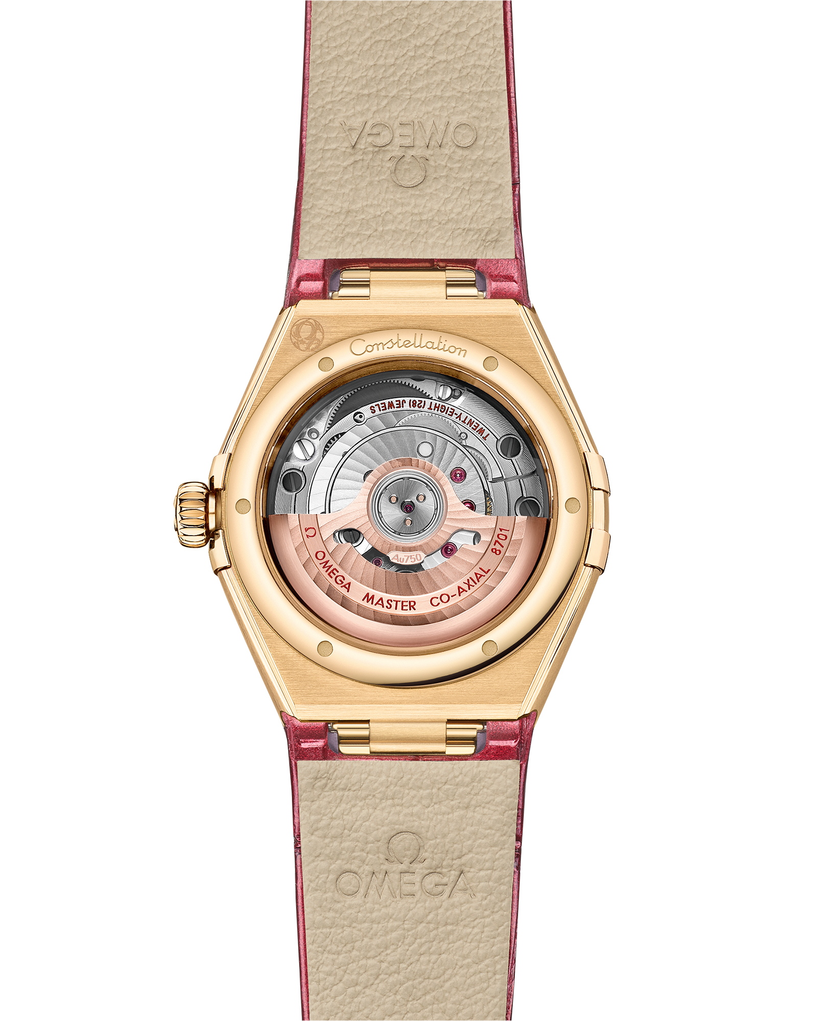 At the heart of this timepiece is the OMEGA Co-Axial Master Chronometer Calibre 8701, visible through the domed scratch-resistant sapphire crystal.