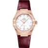 This 29 mm 18K yellow gold model features a diamond-paved bezel, pearled mother-of-pearl dial with diamond hour markers and a date window at the 6 o’clock position. The hands, OMEGA logo, Constellation star and diamond holders are also in 18K yellow gold.