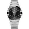 This 41 mm stainless steel model features a polished blue ceramic bezel with Roman numerals in “Grand Feu” white enamel, a white ceramic dial and a date window at the 6 o’clock position. The hands, OMEGA logo, Constellation star and facetted indexes are all blued.