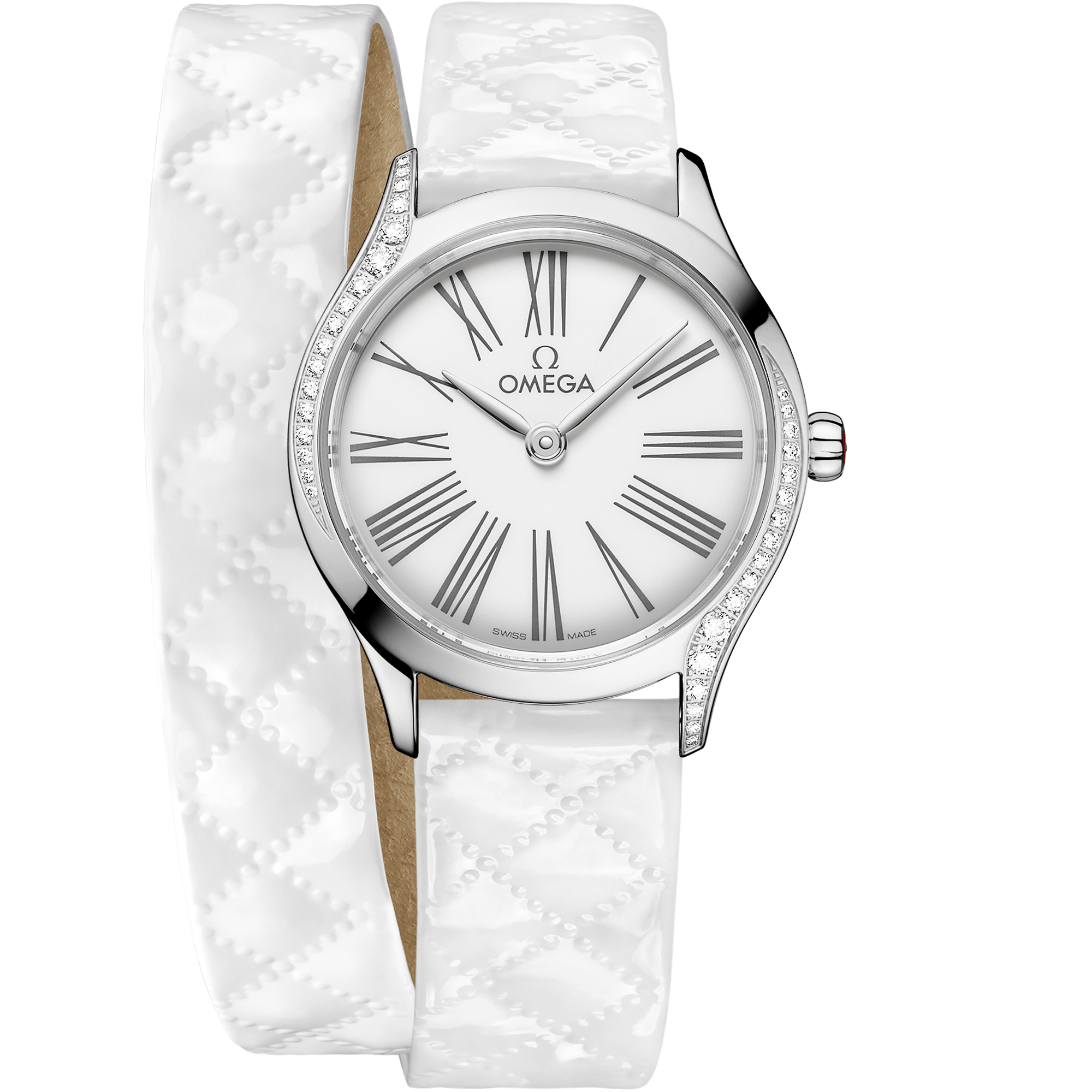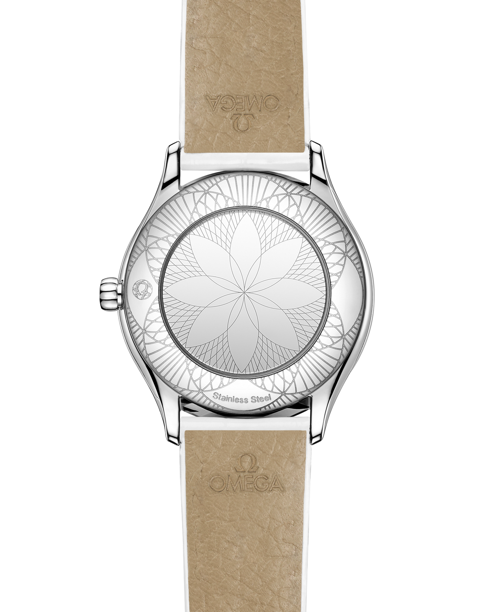 The watch is presented on a double-tour lacquered white calfskin leather strap with a quilted diamond-shaped pattern. It is driven by the OMEGA calibre 4061, which sits behind a special mirrored caseback with a metallised “Her Time” pattern.