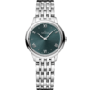 In this 27.5 mm stainless steel model, the PVD blue dial features a stamped random vertical pattern in a sun-brushed finish. The display is distinguished by rhodium-plated hands, as well as alternating Roman numerals and diamond markers. The pure look of the timepiece is completed by a full caseback embossed with a God Chronos medallion.