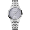 In this 34 mm stainless steel model, the PVD lavender dial features a stamped random vertical pattern in a sun-brushed finish. The display is distinguished by rhodium-plated hands, as well as alternating Roman numerals and diamond markers.