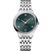 In this 34 mm stainless steel model, the PVD pine green dial features a sun-brushed finish. The display is distinguished by yellow gold-plated hands, as well as alternating Roman numerals and diamond markers.