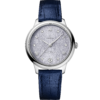 In this 34 mm stainless steel model, the PVD blue dial features a stamped random vertical pattern in a sun-brushed finish. The display is distinguished by rhodium-plated hands, as well as alternating Roman numerals and cabochon indexes.