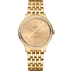 In this 34 mm 18K yellow gold model with its diamond-paved bezel, the dial is crafted from white mother-of-pearl. The display is distinguished by yellow gold-plated hands, as well as alternating Roman numerals and diamond markers.