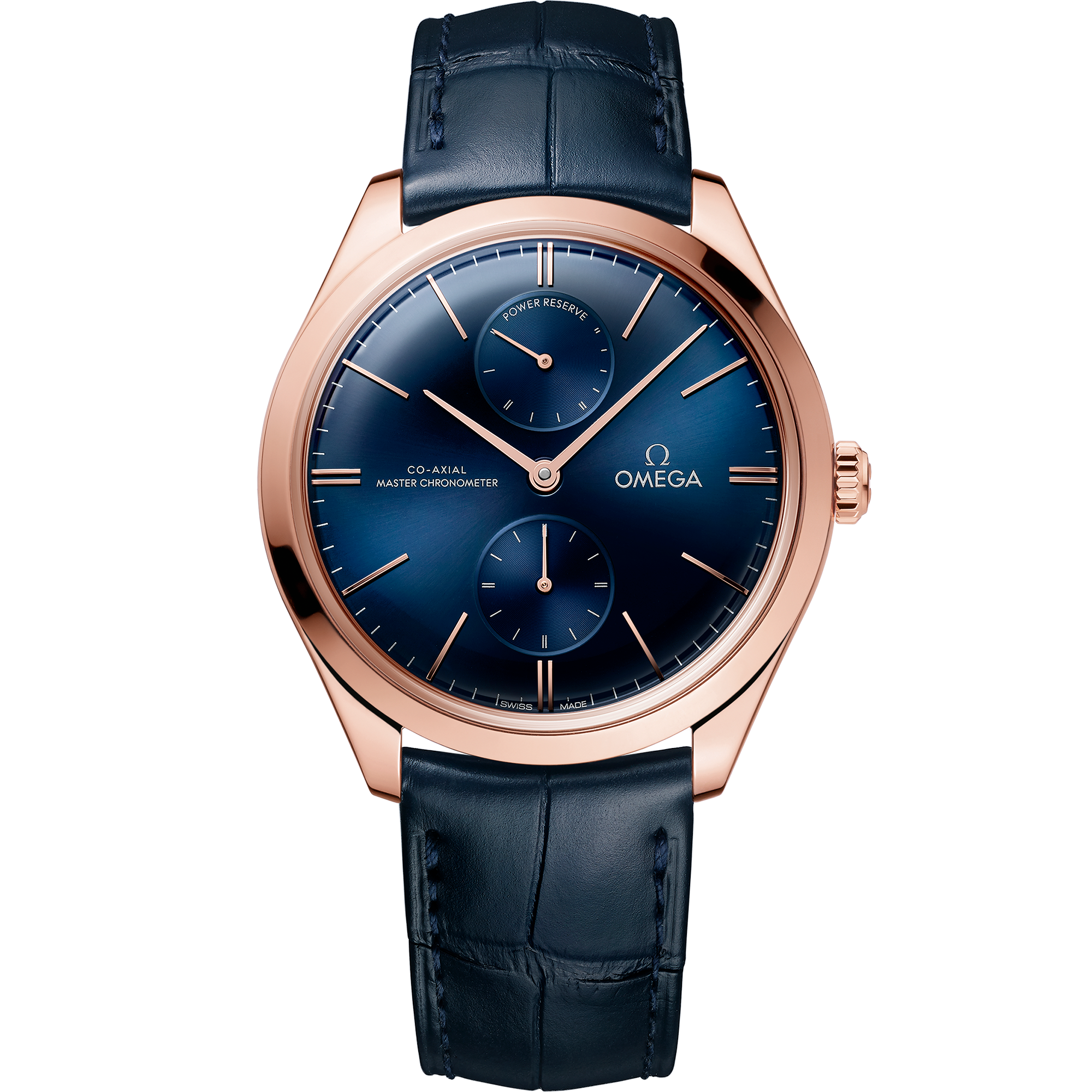 This model has a polished 40 mm 18K Sedna™ gold case, which is presented on a blue leather strap. The domed blue dial includes a Power Reserve display at 12H, a Small Seconds display at 6H, along with hands and domed indexes in 18K Sedna™ gold.