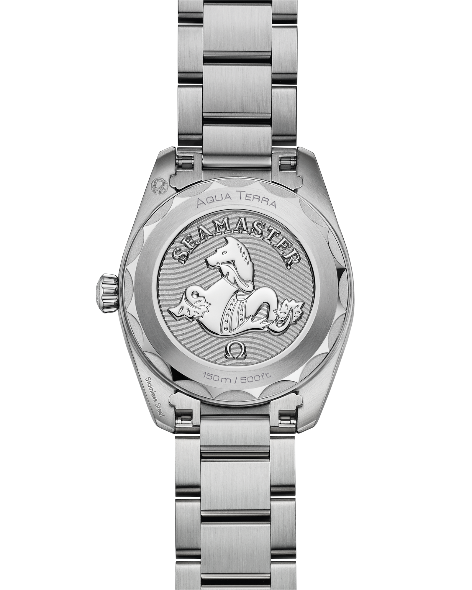 With a symmetrical 28 mm case, this stainless steel model features a white pearled mother-of-pearl dial and 12 diamond indexes in rhodium-plated holders. The hands are also rhodium-plated and the caseback is embossed with the OMEGA Seahorse on a wavy background.
