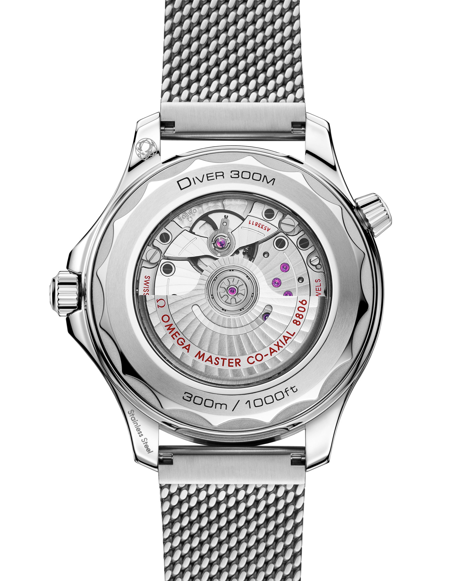 The watch is presented on a brushed mesh bracelet with clasp, and is driven by the OMEGA Co-Axial Master Chronometer Calibre 8806, which can be seen through the sapphire-crystal caseback.