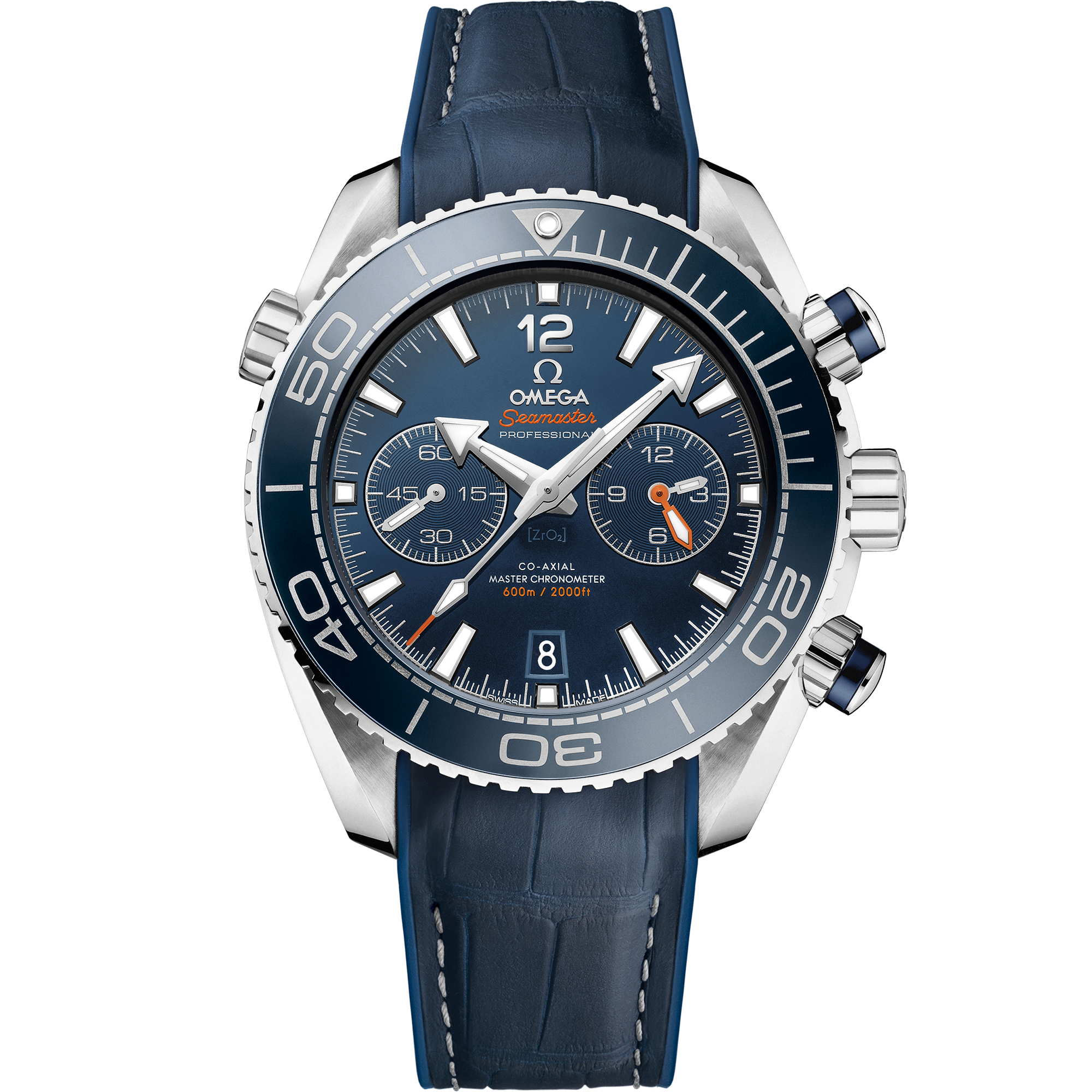 It was with OMEGA’s maritime legacy in mind that the brand launched its Planet Ocean line in 2005. The stylish OMEGA Seamaster Planet Ocean 600M Master Chronometer Chronograph pays homage to OMEGA’s dive watch heritage. This model, with its scratch-resistant sapphire crystal, features a blue ceramic dial with Arabic numerals and a date window at the 6 o’clock position. The dial presents a small seconds sub-dial, as well as 60-minute and 12-hour counters on one dial for intuitive reading of elapsed time. The blue ceramic unidirectional rotating divers’ bezel, with its Liquidmetal™ diving scale, is mounted on a 45.5 mm stainless steel case. Other features include an alveol screw-in caseback and a blue leather strap with rubber lining. The OMEGA Seamaster Planet Ocean 600M Master Chronometer Chronograph is water resistant to 60 bar (600 metres / 2000 feet), and has a helium-escape valve. The OMEGA Master Chronometer calibre 9900 at the heart of this timepiece can be seen through the transparent caseback. To achieve Master Chronometer status, it has passed the 8 rigorous tests set by METAS (The Swiss Federal Institute of Metrology).