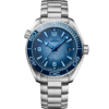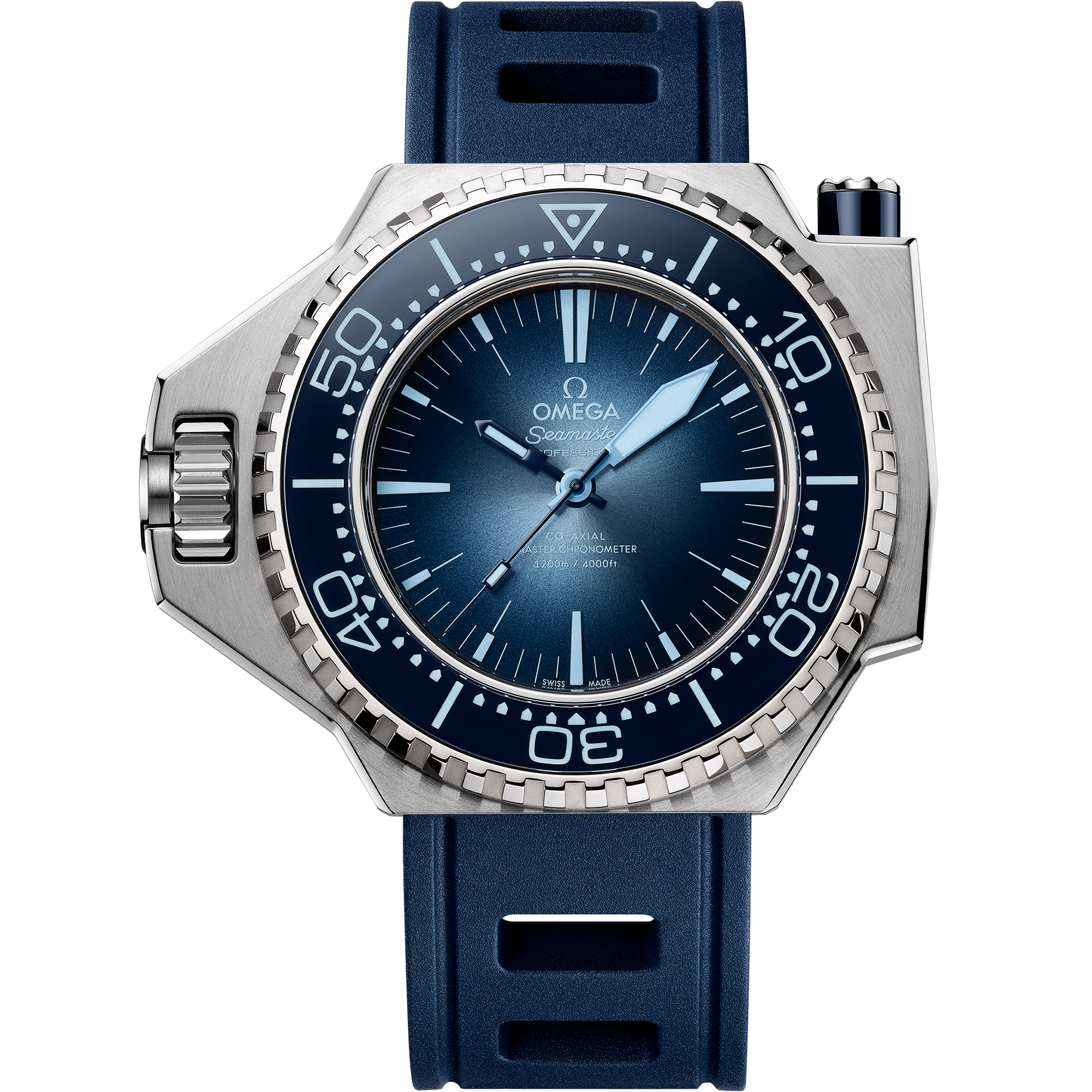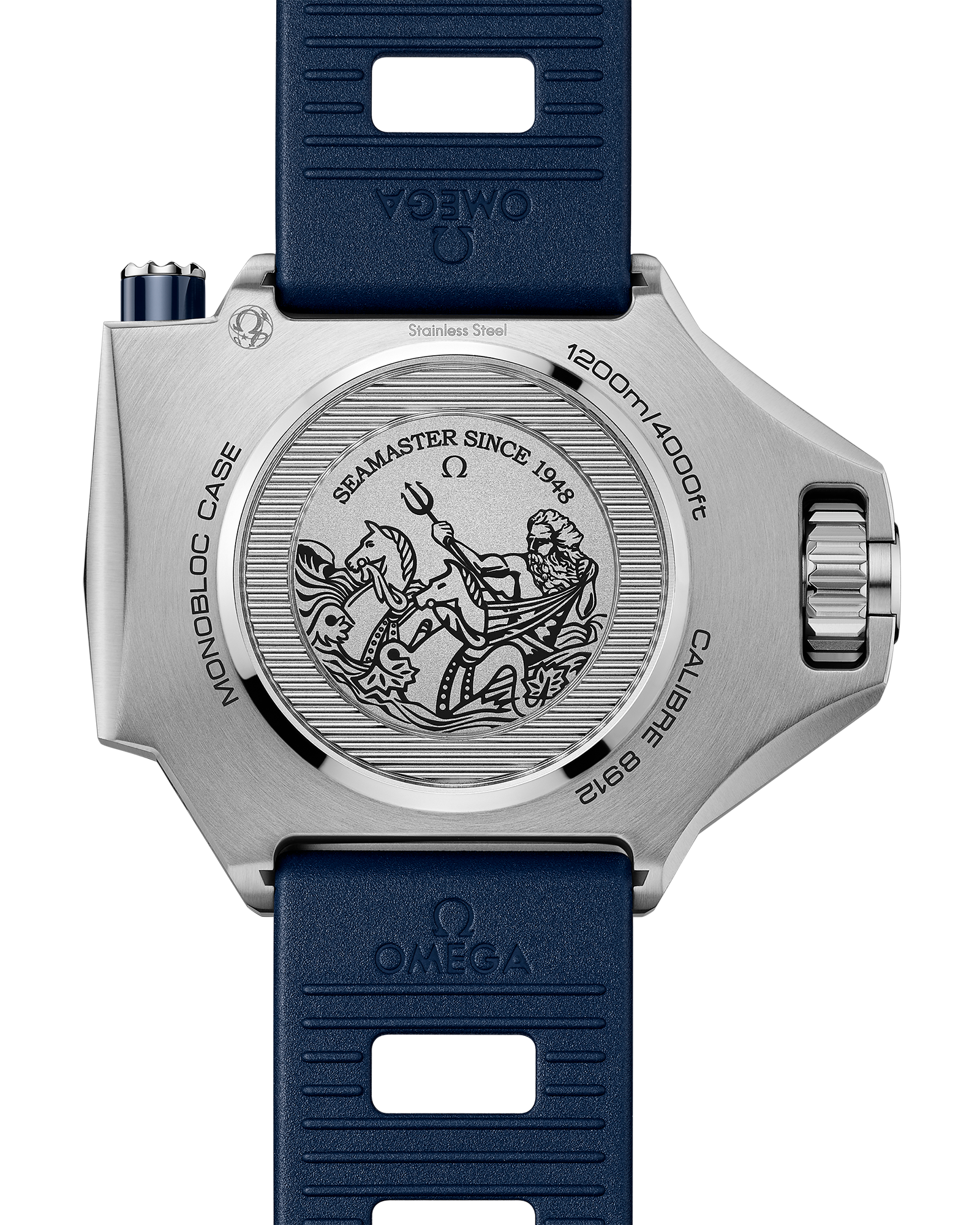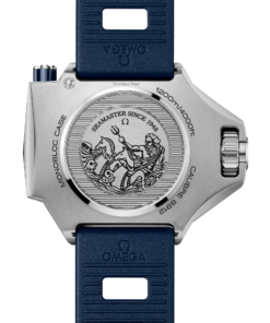 This special Ploprof takes its design cues from OMEGA’s 1970s original. Crafted in O-MEGASTEEL, it has a sun-brushed dial in OMEGA’s own Summer Blue with a gradient finish to reflect the watch’s level of water resistance. The bezel is produced in transparent sapphire crystal, varnished blue on the back, to reveal the light blue diving scale beneath. The iconic mono-bloc case includes the famous screwed-in crown and the characteristic security pusher at 2 o’clock, which on this edition sports a ring in blue ceramic. In keeping with the colour code, OMEGA has filled the varnished hands and indexes with a unique light blue Super-LumiNova. Turning the watch over reveals a laser-engraved commemorative Seamaster logo, framed by engraved waves and depicting a trident-bearing Poseidon and two seahorses: OMEGA’s 1956 original and the brand’s current design. Behind which sits the OMEGA Co-Axial Master Chronometer calibre 8912. An original-style blue rubber strap completes the look.