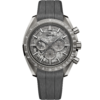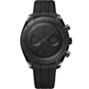 Honouring OMEGA’s legacy of space exploration, this Speedmaster Dark Side of the Moon “Black Black” features a 44.25 mm case in polished-brushed black ceramic. The brushed bezel is also made from black ceramic and features a laser-engraved tachymeter scale that is filled with black Grand Feu enamel. Beneath the front sapphire crystal, the ceramic dial has been sand-blasted by laser and includes a small-seconds display at 9H, a 60-minute and 12-hour recorder at 3H, and a date window at 6H. All of the hands and bevelled indexes are blackened and filled with black Super-LumiNova (green emission). Visible through the caseback, OMEGA’s self-winding Co-Axial Master Chronometer Calibre 9900 has been given a special finish with a matte-blackened rotor, main plate and bridges, as well as black varnished engravings. The watch is worn on a black nylon fabric strap that includes a ceramic foldover clasp and ceramised titanium frame-spring folders.