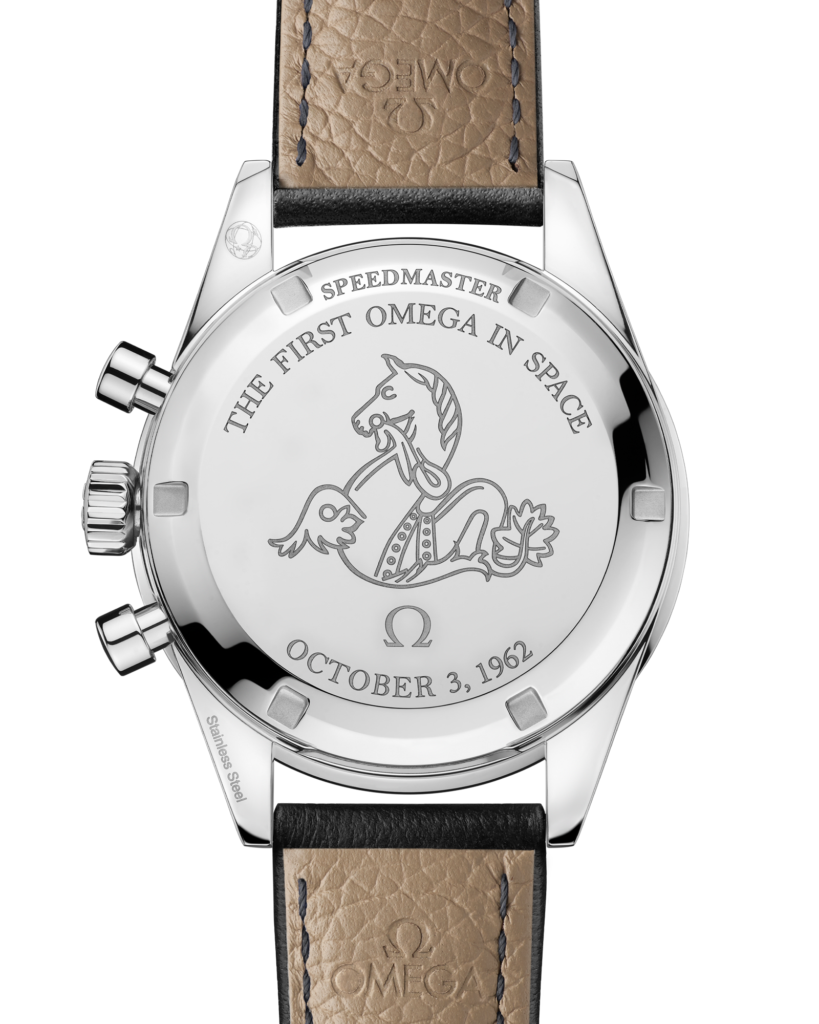 A vintage OMEGA logo is applied on the dial, as well as on the crown, while the caseback features the famous Seahorse medallion, and the engravings, “THE FIRST OMEGA IN SPACE” and “OCTOBER 3, 1962”.