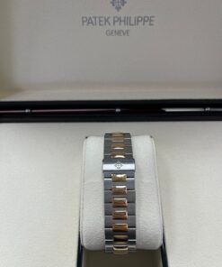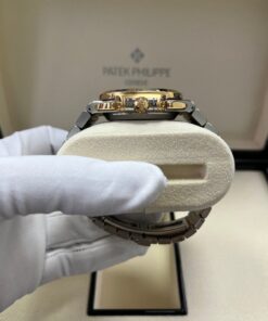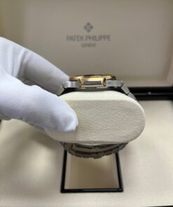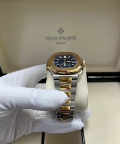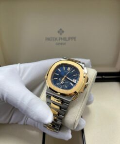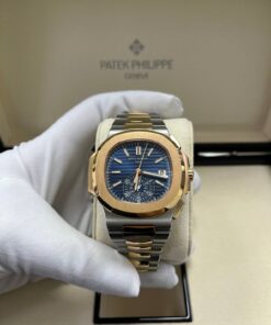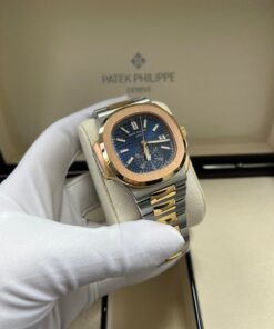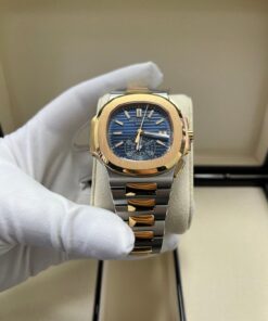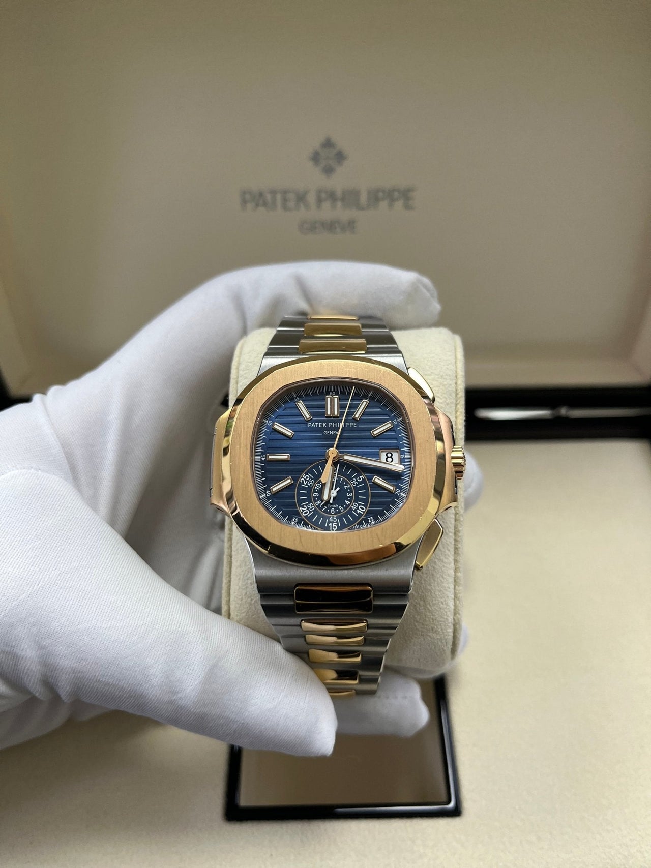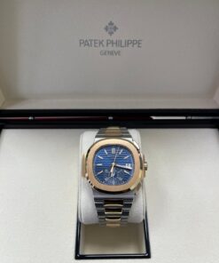 Nautilus 40.5mm Two Tone Blue Dial- 40.5mm stainless steel and 18K rose gold case, sapphire crystal back, blue gradient dial with gold applied hour markers with luminescent coating, self-winding Caliber CH 28-520 C movement with date, chronograph, 60-minute and 12-hour mono counter at 6 o’clock, sweep seconds hand (chronograph hand), approximately 45-55 hours of power reserve, stainless steel and 18K rose gold bracelet Nautilus fold-over clasp. Water-resistant to 120 meters.