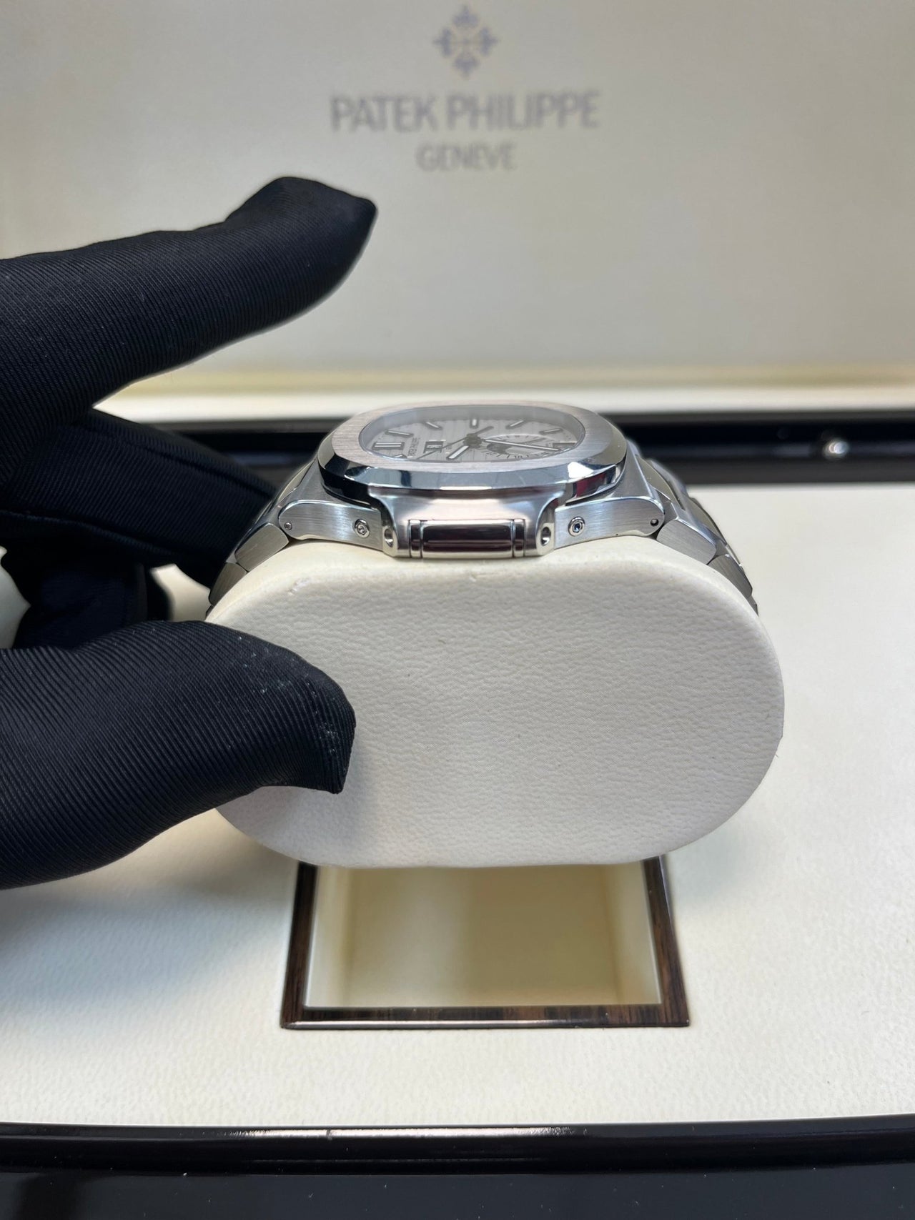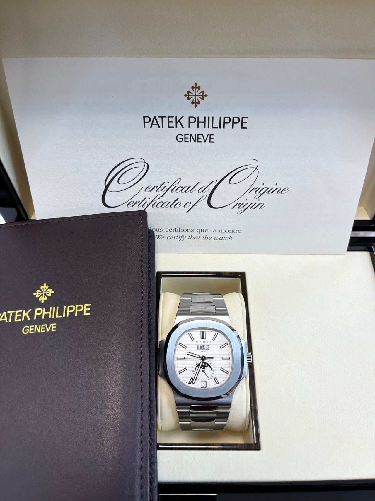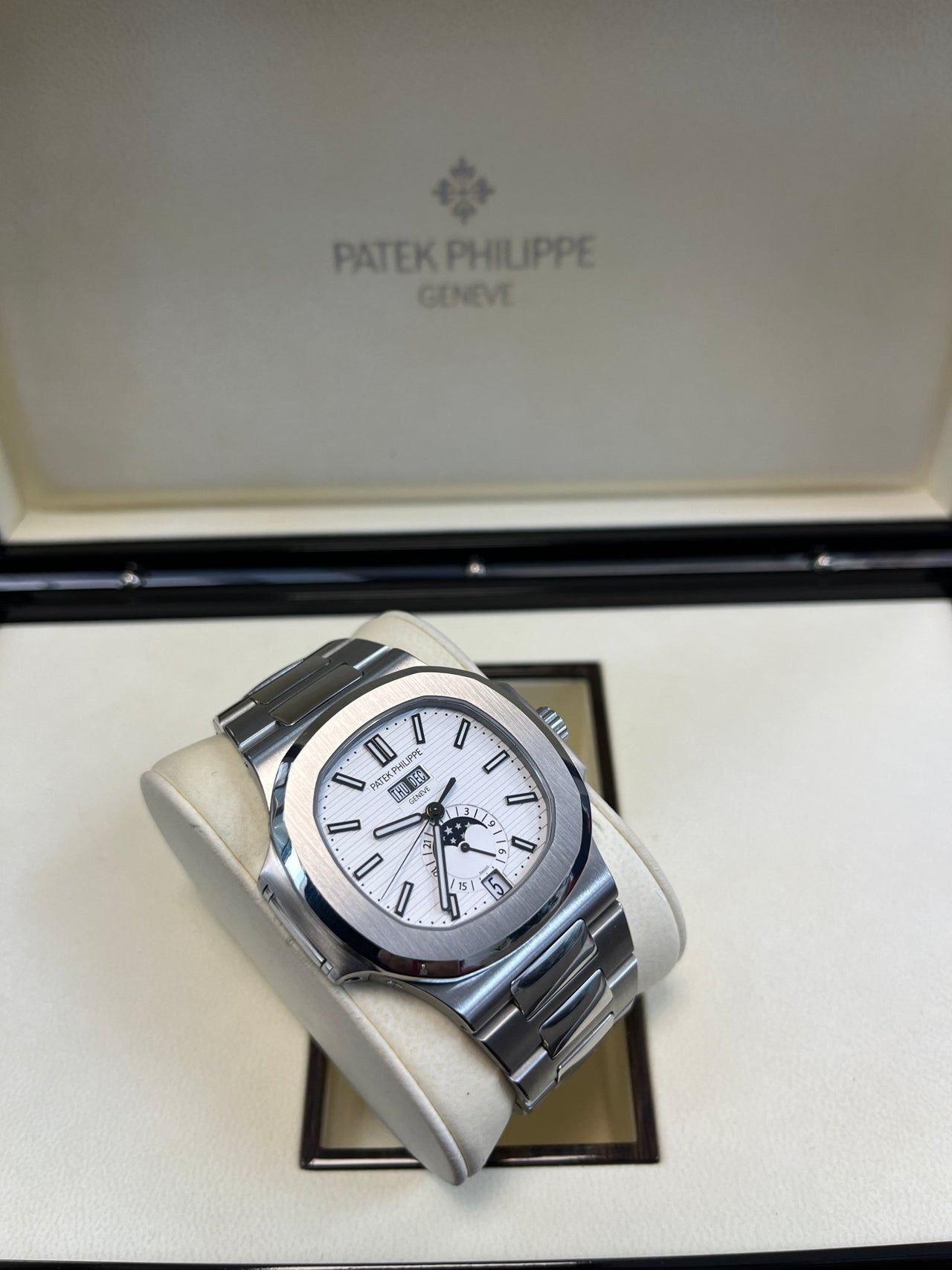 Patek Philippe Nautilus Annual Calendar (57261A010) self – winding automatic watch, features a 40.5mm stainless steel case surrounding a white dial on a stainless steel bracelet with folding buckle. Functions include hours, minutes, seconds, day, date, month and moon phase.
