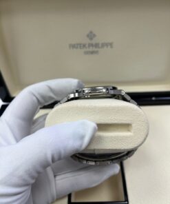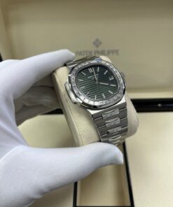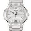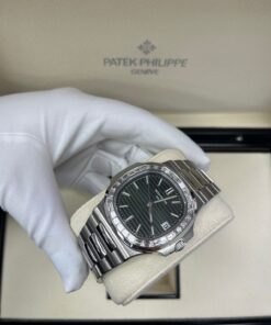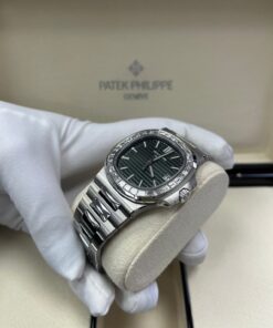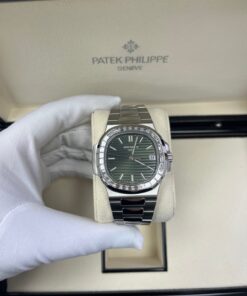 Patek Philippe introduces an original alliance between stainless steel and baguette-cut diamonds in a new version of the Nautilus 5711 model. The distinctive shape of the octagonal bezel with its softened angles is accentuated by a row of 32 internally flawless Top Wesselton baguette-cut diamonds (~3.6 cts). The fire of the diamonds highlights olive-green dial enhanced by an embossed horizontal motif and sunburst decoration. This elegant sports model houses a self-winding caliber visible through a transparent sapphire case-back.