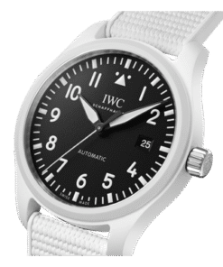 The Pilot’s Watch Automatic 41 TOP GUN Lake Tahoe features a case made of striking white ceramic, a black dial with white numerals and indices and a white rubber strap.