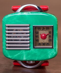 Inspired by nostalgia, HAUTLENCE imagined what its watches might have looked like in the 1940s. This concept received such positive feedback that the brand decided to create a special series of only 10 pieces. The RETROVISION ’47 features a unique rectangular case with rounded edges, reminiscent of old television sets but inspired by the 1940s General Television & Radio Corp. Chicago Model 5A5 radio. The hand-painted titanium case of the Retrovision ’47 mimics the marbled green and white Bakelite of the historic radio, with titanium lugs designed like carrying handles and a crown at 6 o’clock for symmetry. A red leather strap adds a vintage touch. The watch has a traditional hour and minute dial with central hands, and a small offset dial featuring red hands modeled after a frequency selector. The left side includes a “speaker” grill revealing a 60-second flying tourbillon. The case back is styled after the radio’s back, engraved with the brand name and serial number, and a round sapphire display back reveals the D20 automatic caliber with a 72-hour power reserve. The RETROVISION ’47 is a whimsical, evocative piece that blends HAUTLENCE’s horological creativity with a retro aesthetic, celebrating their unique vision of kinetic, wearable art.