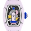 Richard Mille 07-01 Coloured Ceramics: A Timeless Summer Collection This collection from Richard Mille blends summer’s joyful vibe with the 1980s Memphis Design movement. It offers lightweight TZP ceramic cases, meticulous guillochage, and a choice of three soft pastel hues: blush pink, lavender, and powder blue. The RM 07-01 Coloured Ceramics by Richard Mille combines innovation and performance, marrying modernity with traditional craftsmanship. Guillochage, an art form of intricate lines, adds texture and plays with light and shadow. TZP ceramic’s durability and color retention ensure lasting beauty. The grey PVD-treated red gold dial showcases an engraved Memphis motif, complemented by colored ceramics, laser-cut rubber appliques, and diamond details. Choose from three different versions: blush pink, lavender, or powder blue TZP ceramics for enduring elegance.