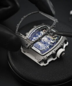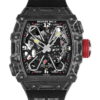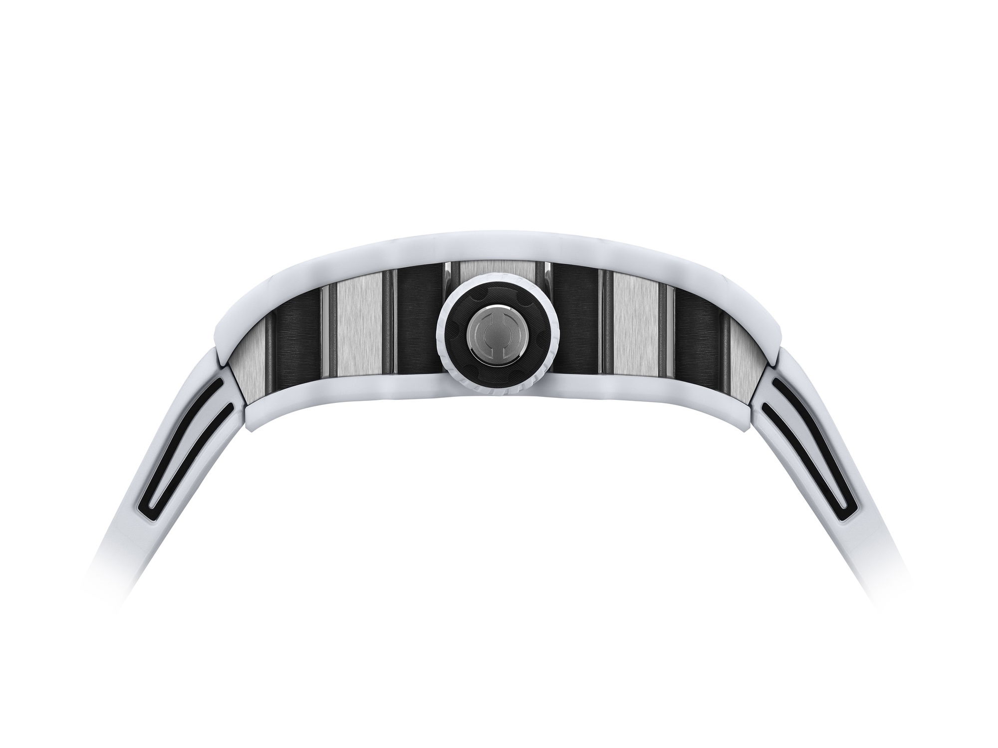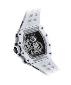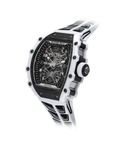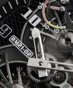 The RM 21-02 Tourbillon Aerodyne is a limited-edition, 50-piece watch featuring a white Quartz TPT®, Carbon TPT®, and titanium construction. This model is an updated version of the manual-winding tourbillon Calibre RM21-02, known for its combination of precision, lightness, and durability. Richard Mille has a history of incorporating engineering materials from various industries, particularly aeronautics, into their watch designs. Carbon TPT®️, a key material in this watch, is commonly in both the aeronautics and automotive industries, including in aircraft fuselages and Formula 1 cars. This material forms the baseplate of the RM 21-02 Tourbillon Aerodyne, along with a honeycomb structure made of black-PVD treated HAYNES®️ 214®️, a material in gas turbine parts and researched by NASA for supersonic aircraft wings. The design of the RM 21-02 Tourbillon Aerodyne includes a central winding barrel and tourbillon balanced on lightweight titanium bridges. It features torque and power-reserve indicators, along with a function selector, providing insights into the energy stored. The case of the RM 21-02 is a complex construction blending Quartz TPT®, Carbon TPT®, and titanium, resulting in a visually striking and robust design capable of withstanding regular use. This construction is one of the most sophisticated ever produced by Richard Mille. The brand’s commitment to innovation and the use of advanced materials is evident in the RM 21-02 Tourbillon Aerodyne, showcasing a unique aesthetic and technical prowess.